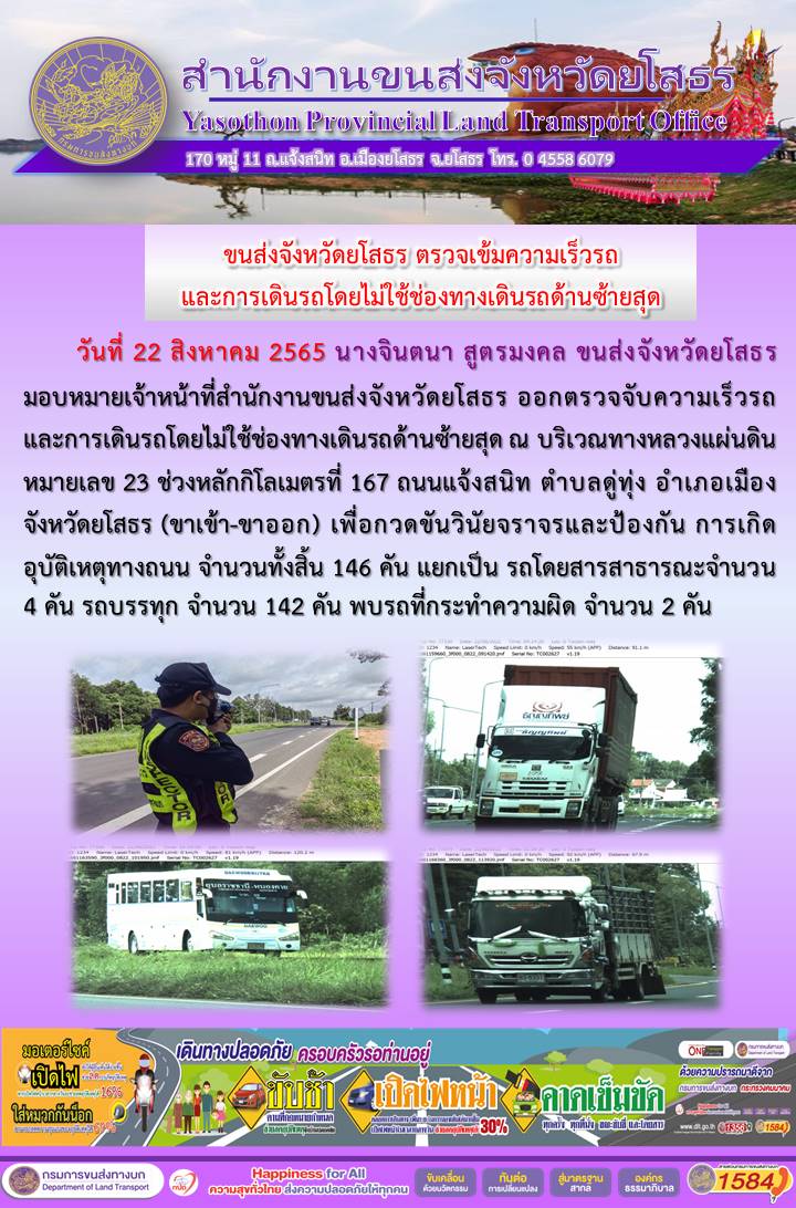 วันที่ 22 สิงหาคม 2565 เจ้าหน้าที่สำนักงานขนส่งจังหวัดยโสธร ออกตั้งจุดตรวจจับความเร็ว