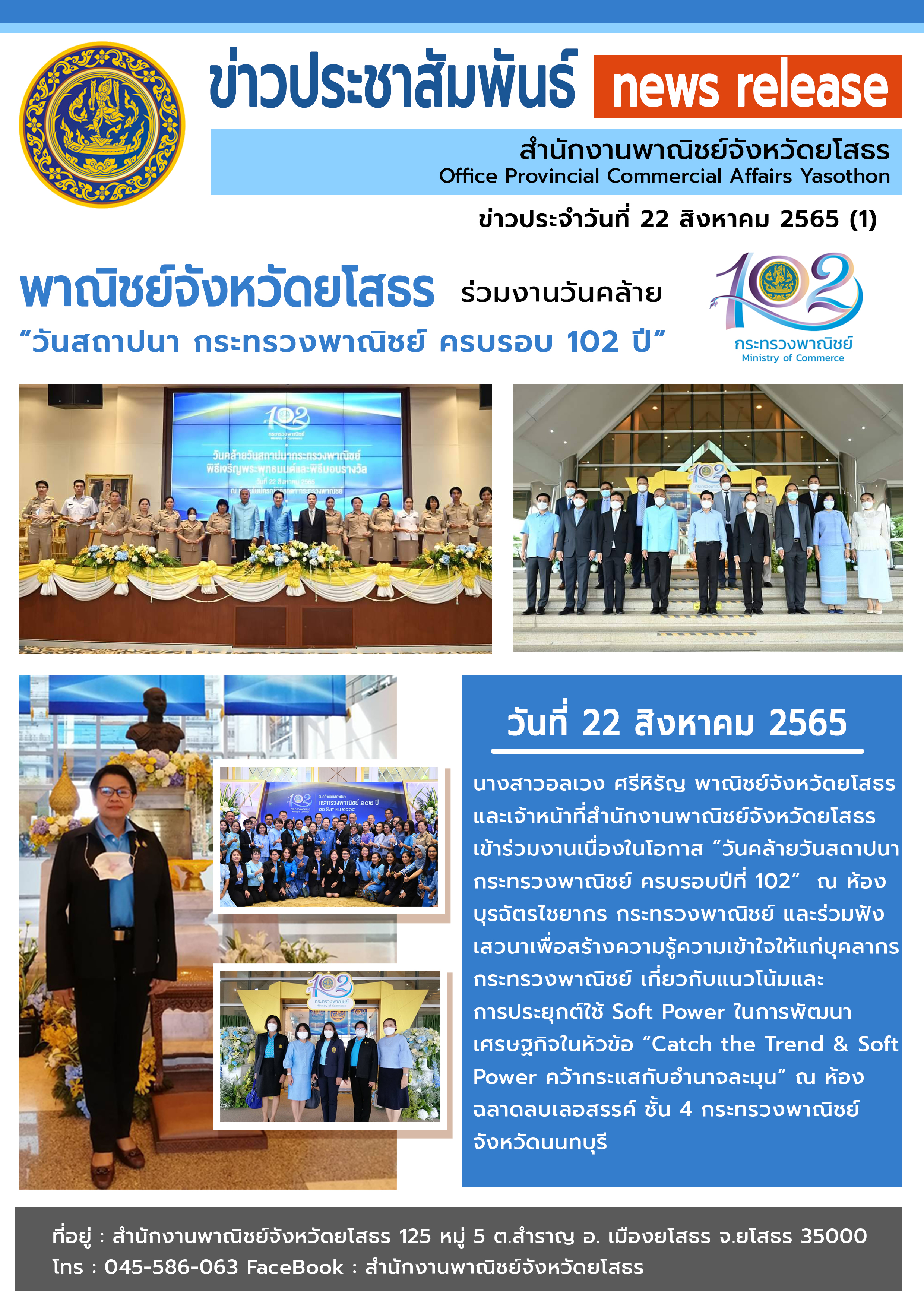 พาณิชย์จังหวัดยโสธร เข้าร่วมงานเนื่องในโอกาส ”วันคล้ายวันสถาปนากระทรวงพาณิชย์ ครบรอบปีที่ 102”