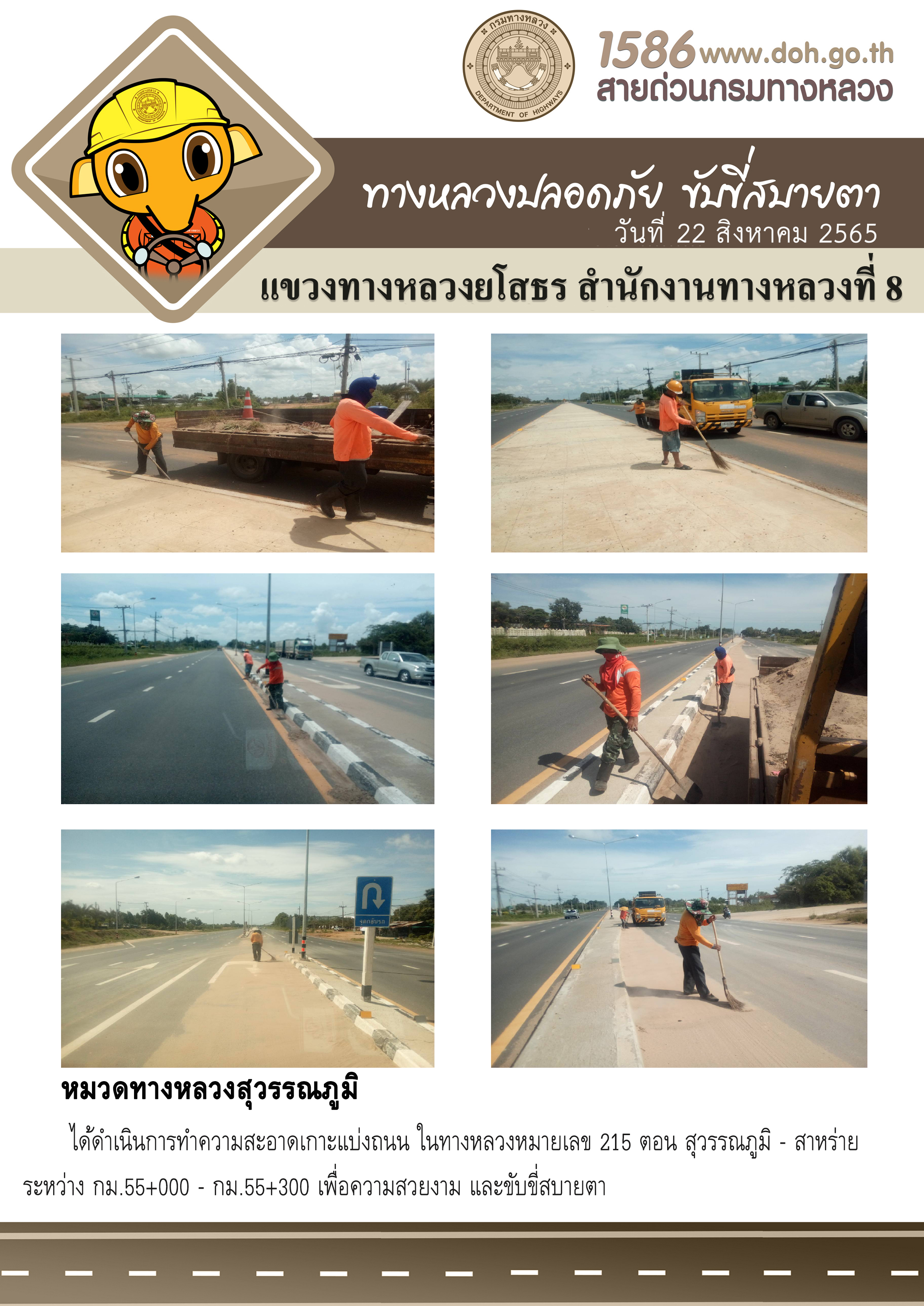 วันที่ 22 สิงหาคม 2565 หมวดทางหลวงสุวรรณภูมิ ได้ดำเนินการทำความสะอาดเกาะแบ่งถนน ในทางหลวงหมายเลข 215 ตอน สุวรรณภูมิ - สาหร่าย ระหว่าง กม.55+000 - กม.55+300 เพื่อความสวยงาม และขับขี่สบายตา