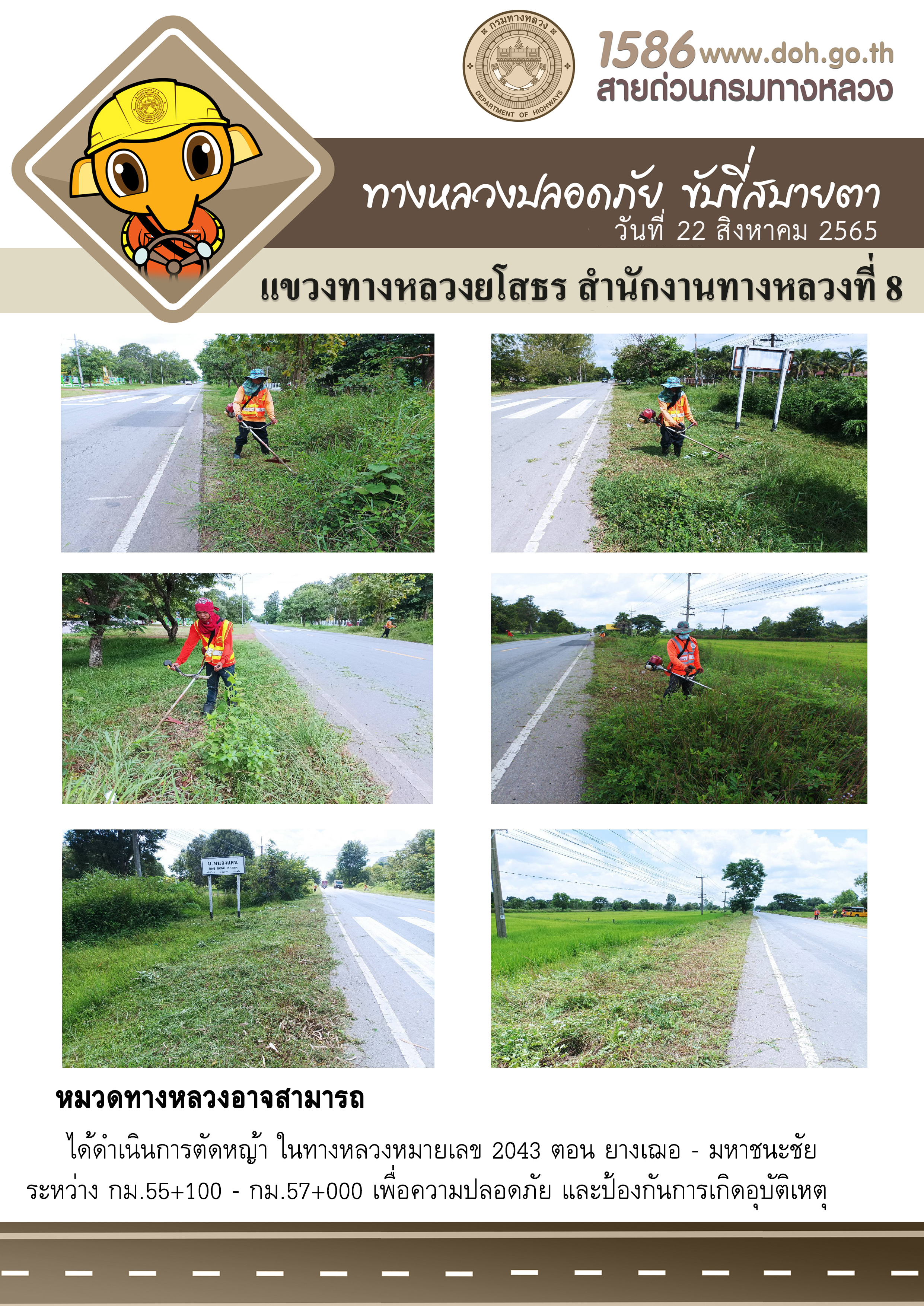 วันที่ 22 สิงหาคม 2565 หมวดทางหลวงอาจสามารถ ได้ดำเนินการตัดหญ้า ในทางหลวงหมายเลข 2043 ตอน ยางเฌอ - มหาชนะชัย ระหว่าง กม.55+100 - กม.57+000 เพื่อความปลอดภัย และป้องกันการเกิดอุบัติเหตุ