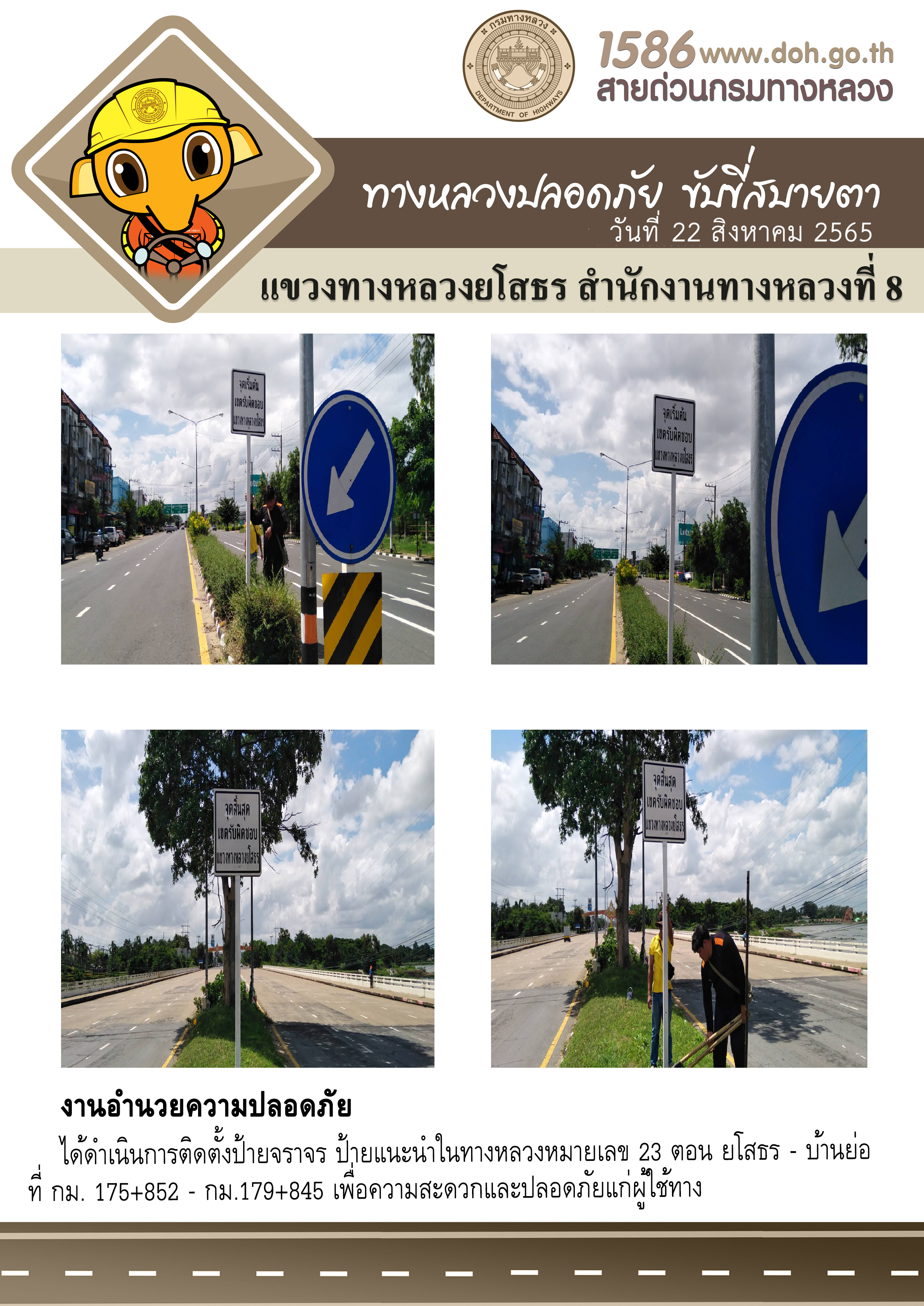 วันที่ 22 สิงหาคม 2565 งานอำนวยความปลอดภัย ได้ดำเนินการติดตั้งป้ายจราจร ป้ายแนะนำในทางหลวงหมายเลข 23 ตอน ยโสธร - บ้านย่อ ที่ กม. 175+852 - กม.179+845 เพื่อความสะดวกและปลอดภัยแก่ผู้ใช้ทาง