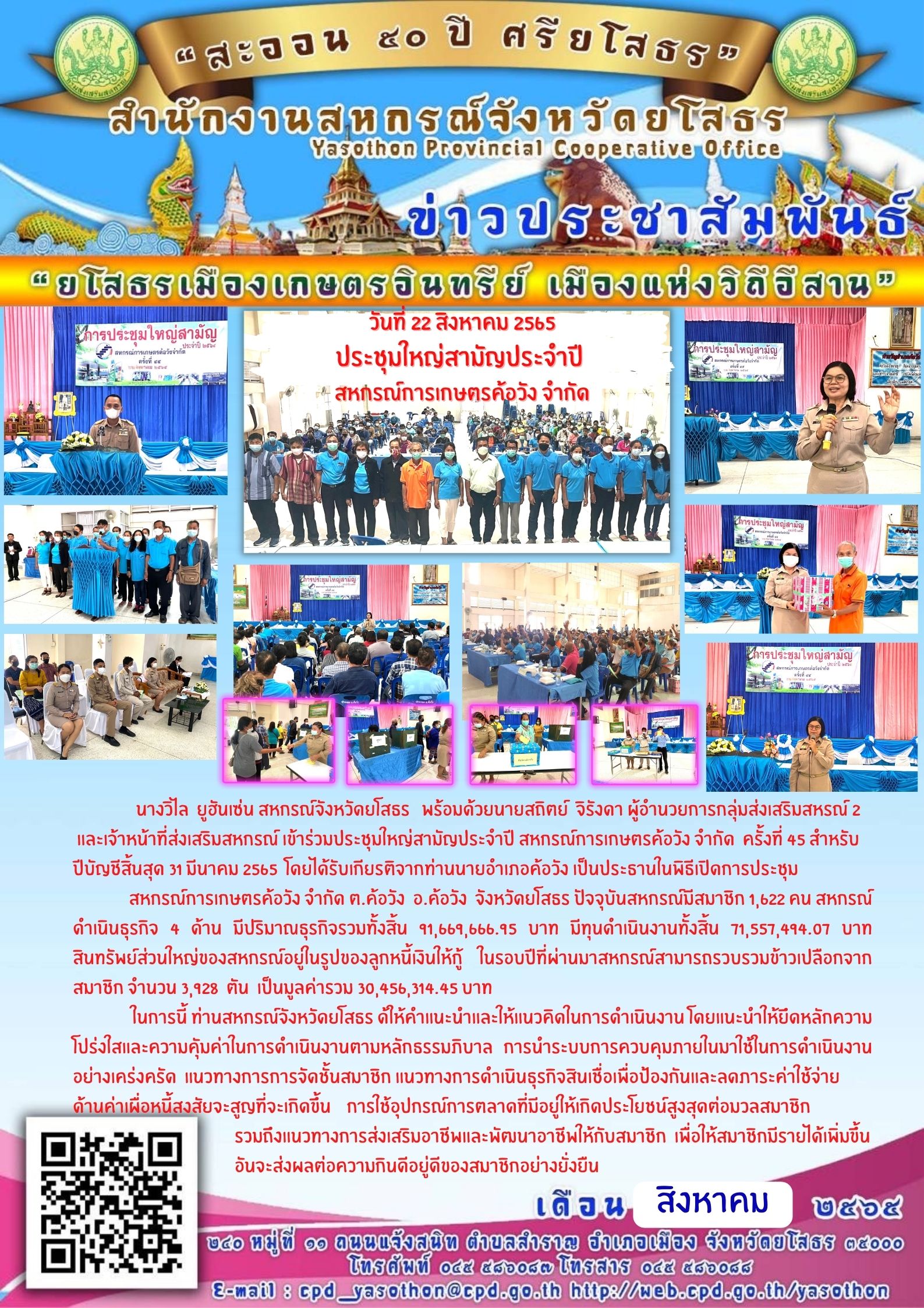 เจ้าหน้าที่สำนักงานสหกรณ์จังหวัดยโสธร เข้าร่วมประชุมใหญ่สามัญประจำปี สหกรณ์การเกษตรค้อวัง จำกัด ครั้งที่ 45 สำหรับปีบัญชีสิ้นสุด 31 มีนาคม 2565