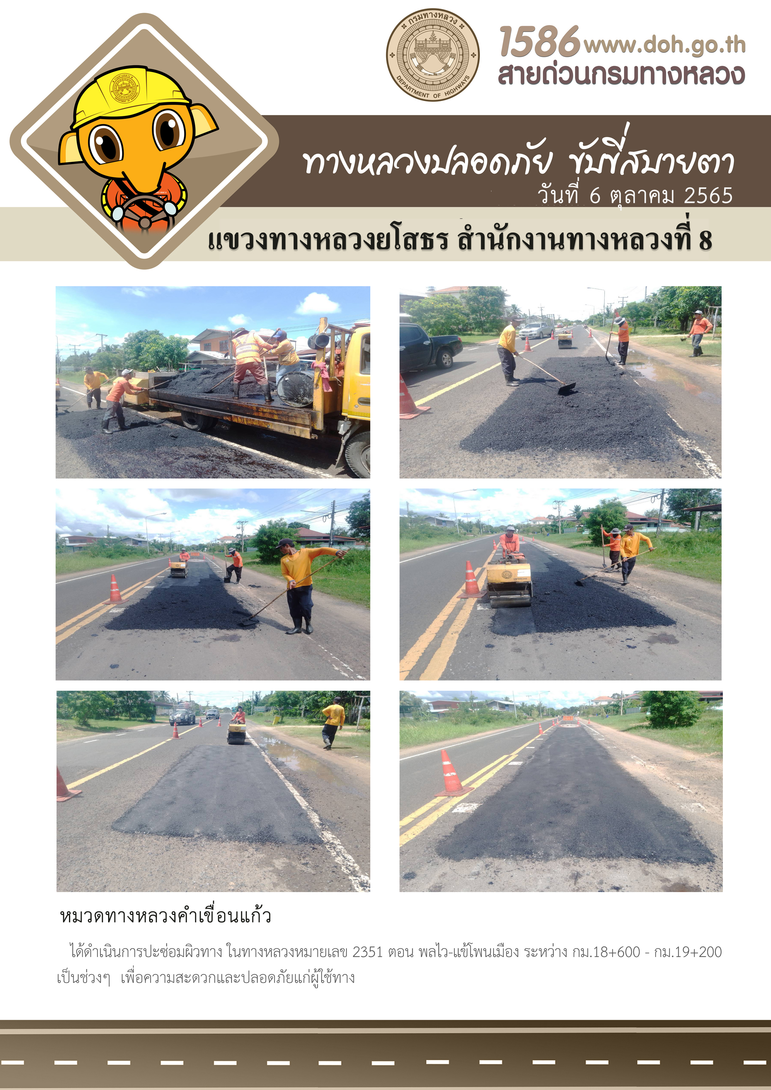 วันที่ 6 ตุลาคม 2565 หมวดทางหลวงคำเขื่อนแก้ว ได้ดำเนินการปะซ่อมผิวทาง ในทางหลวงหมายเลข 2351 ตอน พลไว-แข้โพนเมือง ระหว่าง กม.18+600 - กม.19+200 เป็นช่วงๆ เพื่อความสะดวกและปลอดภัยแก่ผู้ใช้ทาง