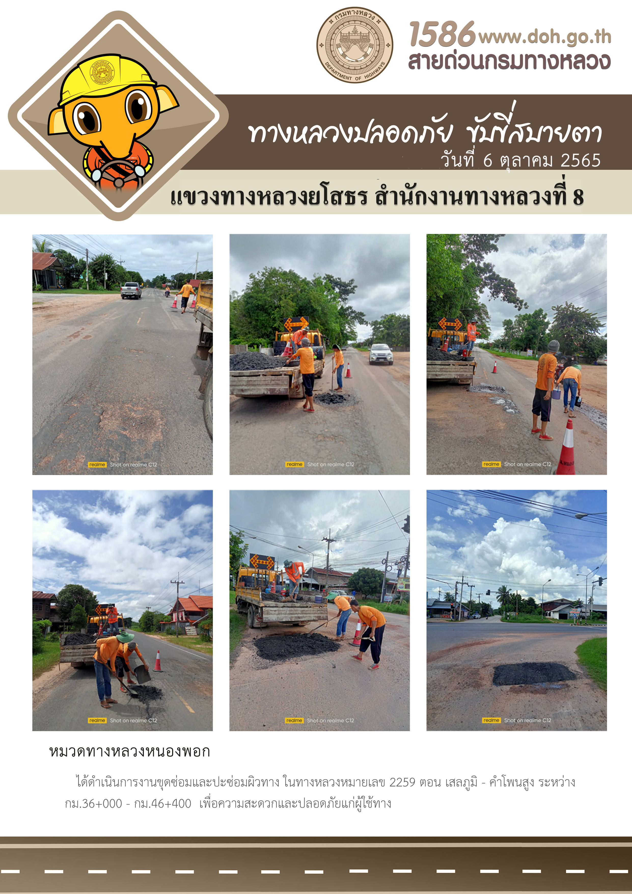 วันที่ 6 ตุลาคม 2565 หมวดทางหลวงหนองพอก ได้ดำเนินการงานขุดซ่อมและปะซ่อมผิวทาง ในทางหลวงหมายเลข 2259 ตอน เสลภูมิ - คำโพนสูง ระหว่าง กม.36+000 - กม.46+400 เพื่อความสะดวกและปลอดภัยแก่ผู้ใช้ทาง