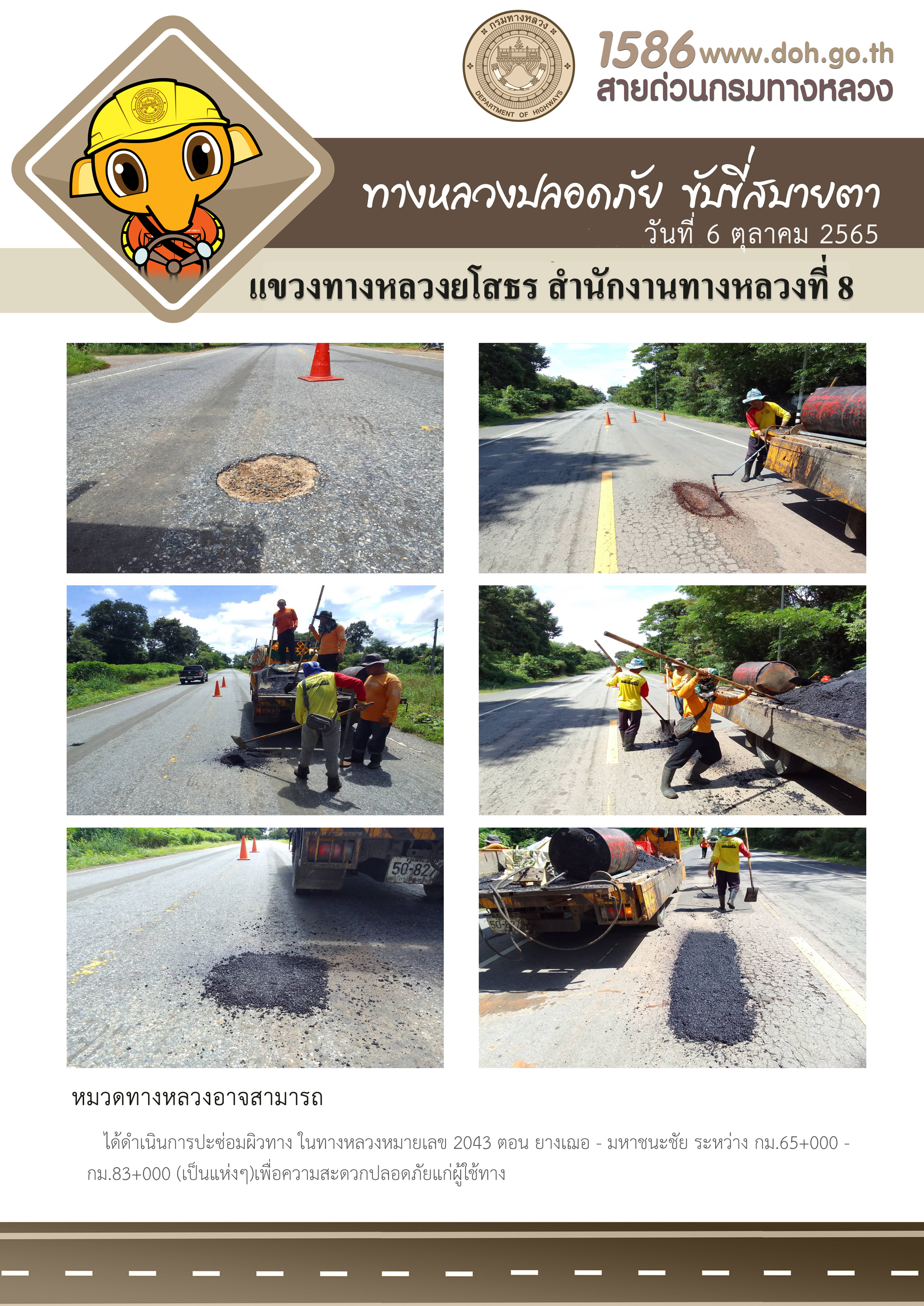วันที่ 6 ตุลาคม 2565 หมวดทางหลวงอาจสามารถ ได้ดำเนินการปะซ่อมผิวทาง ในทางหลวงหมายเลข 2043 ตอน ยางเฌอ - มหาชนะชัย ระหว่าง กม.65+000 - กม.83+000 (เป็นแห่งๆ) เพื่อความสะดวกปลอดภัยแก่ผู้ใช้ทาง