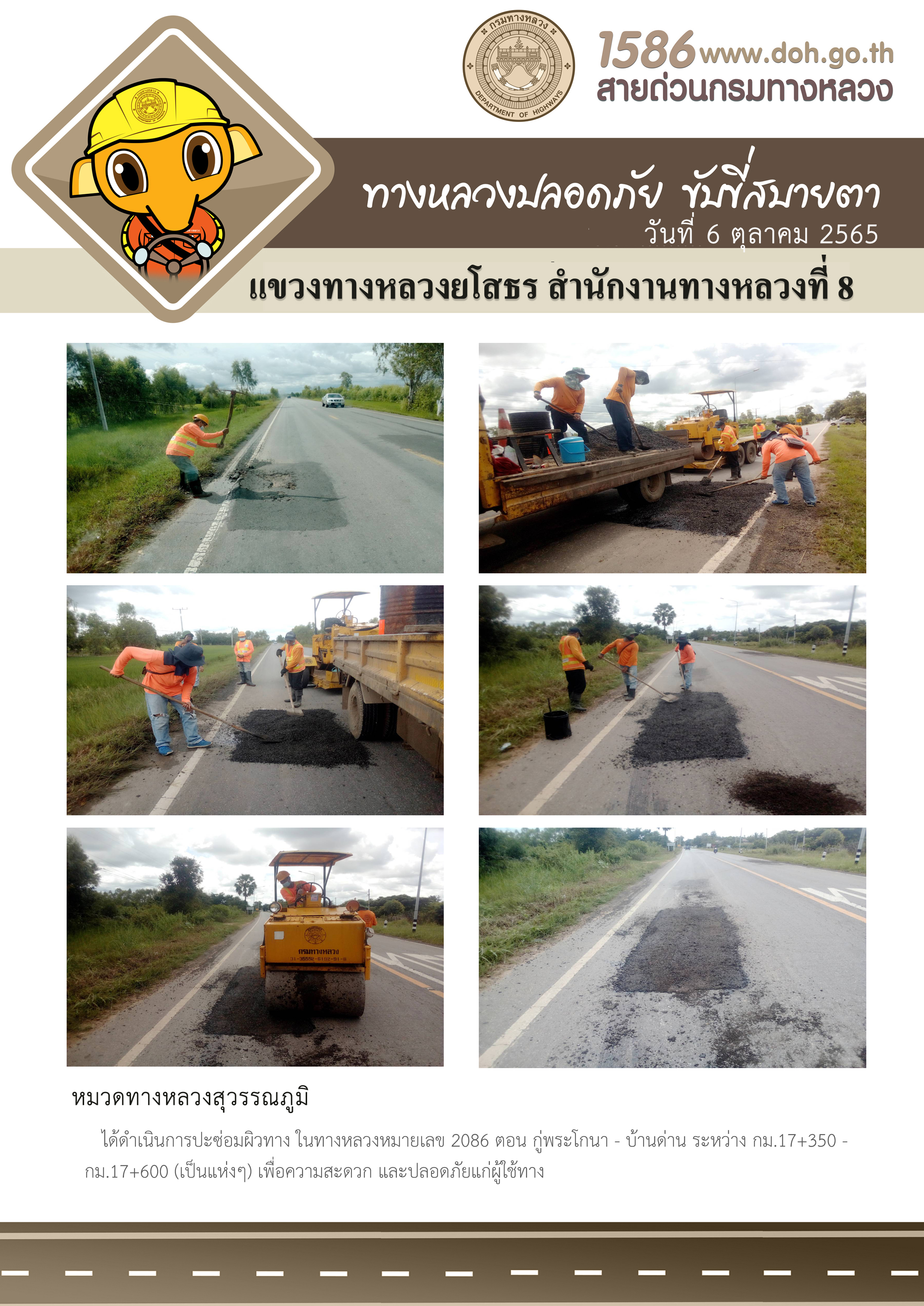 วันที่ 6 ตุลาคม 2565 หมวดทางหลวงสุวรรณภูมิ ได้ดำเนินการปะซ่อมผิวทาง ในทางหลวงหมายเลข 2086 ตอน กู่พระโกนา - บ้านด่าน ระหว่าง กม.17+350 - กม.17+600 (เป็นแห่งๆ) เพื่อความสะดวก และปลอดภัยแก่ผู้ใช้ทาง