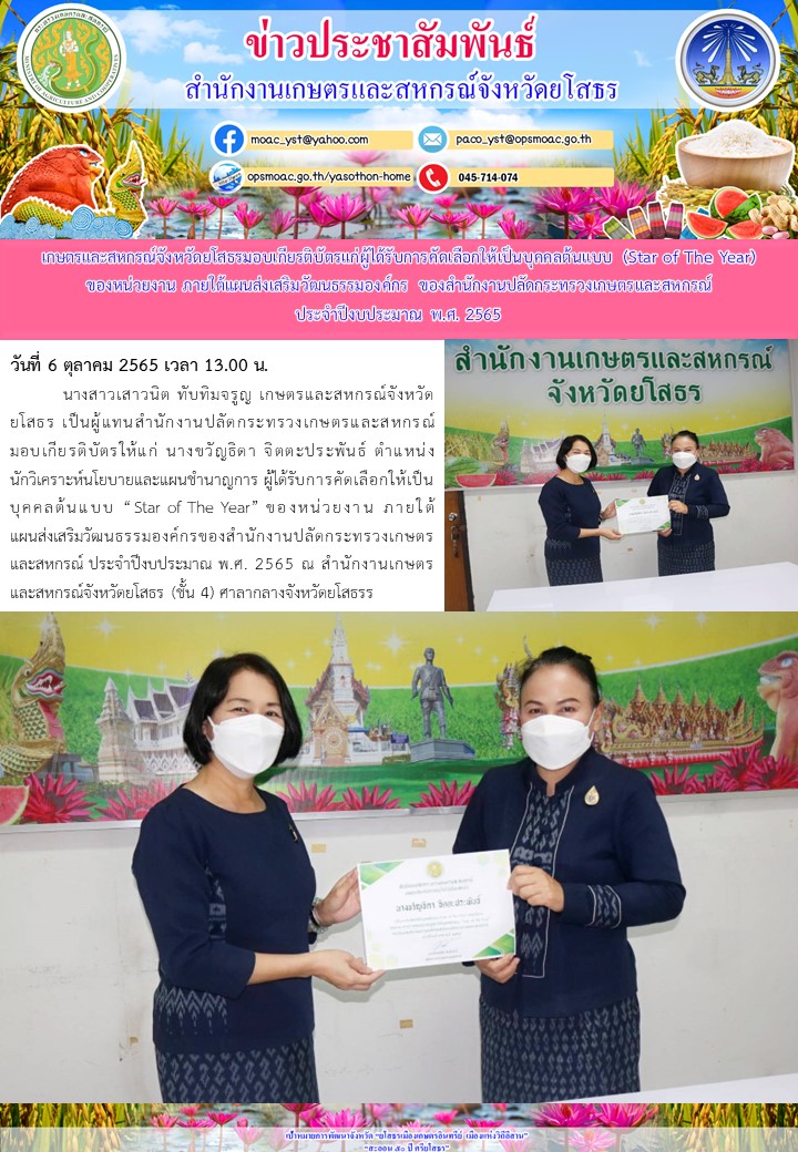 เกษตรษตรและสหกรณ์จังหวัดยโสธรมอบเกียรติบัตรแก่ผู้ได้รับการคัดเลือกให้เป็นบุคคลต้นแบบ (Star of The Year) ของหน่วยงาน ภายใต้แผนส่งเสริมวัฒนธรรมองค์กร ของสำนักงานปลัดกระทรวงเกษตรและสหกรณ์ ประจำปีงบประมาณ พ.ศ. 2565
