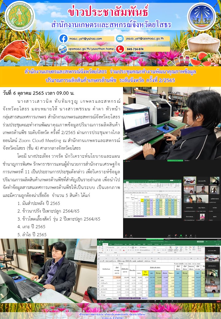 นางสาวเสาวนิต ทับทิมจรูญ เกษตรและสหกรณ์จังหวัดยโสธร มอบหมายให้ นางสาวพชรมน คำตา หัวหน้ากลุ่มสารสนเทศการเกษตร สำนักงานเกษตรและสหกรณ์จังหวัดยโสธร ร่วมประชุมคณะทำงานพัฒนาคุณภาพข้อมูลปริมาณการผลิตสินค้าเกษตรด้านพืช ระดับจังหวัด ครั้งที่ 2/2565 ผ่านการประชุมทางไกลออนไลน์ Zoom Cloud Meeting ณ สำนักงานเกษตรและสหกรณ์จังหวัดยโสธร (ชั้น 4) ศาลากลางจังหวัดยโสธร
