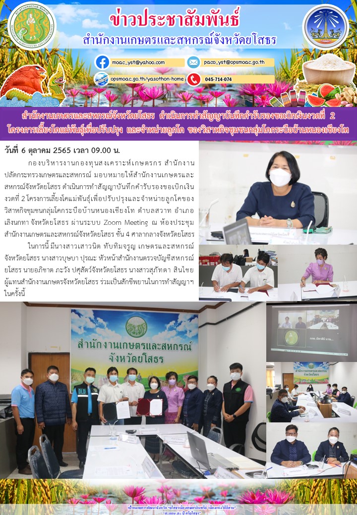 กองบริหารงานกองทุนสงเคราะห์เกษตรกร สำนักงานปลัดกระทรวงเกษตรและสหกรณ์ มอบหมายให้สำนักงานเกษตรและสหกรณ์จังหวัดยโสธร ดำเนินการทำสัญญาบันทึกคำรับรองขอเบิกเงิน งวดที่ 2 โครงการเลี้ยงโคแม่พันธุ์เพื่อปรับปรุงและจำหน่ายลูกโคของวิสาหกิจชุมชนกลุ่มโคกระบือบ้านห