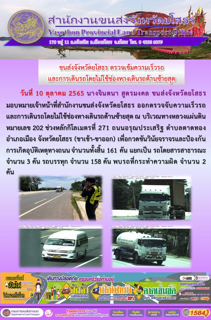 วันที่ 10 ตุลาคม 2565 เจ้าหน้าที่สำนักงานขนส่งจังหวัดยโสธร ออกตั้งจุดตรวจจับความเร็ว