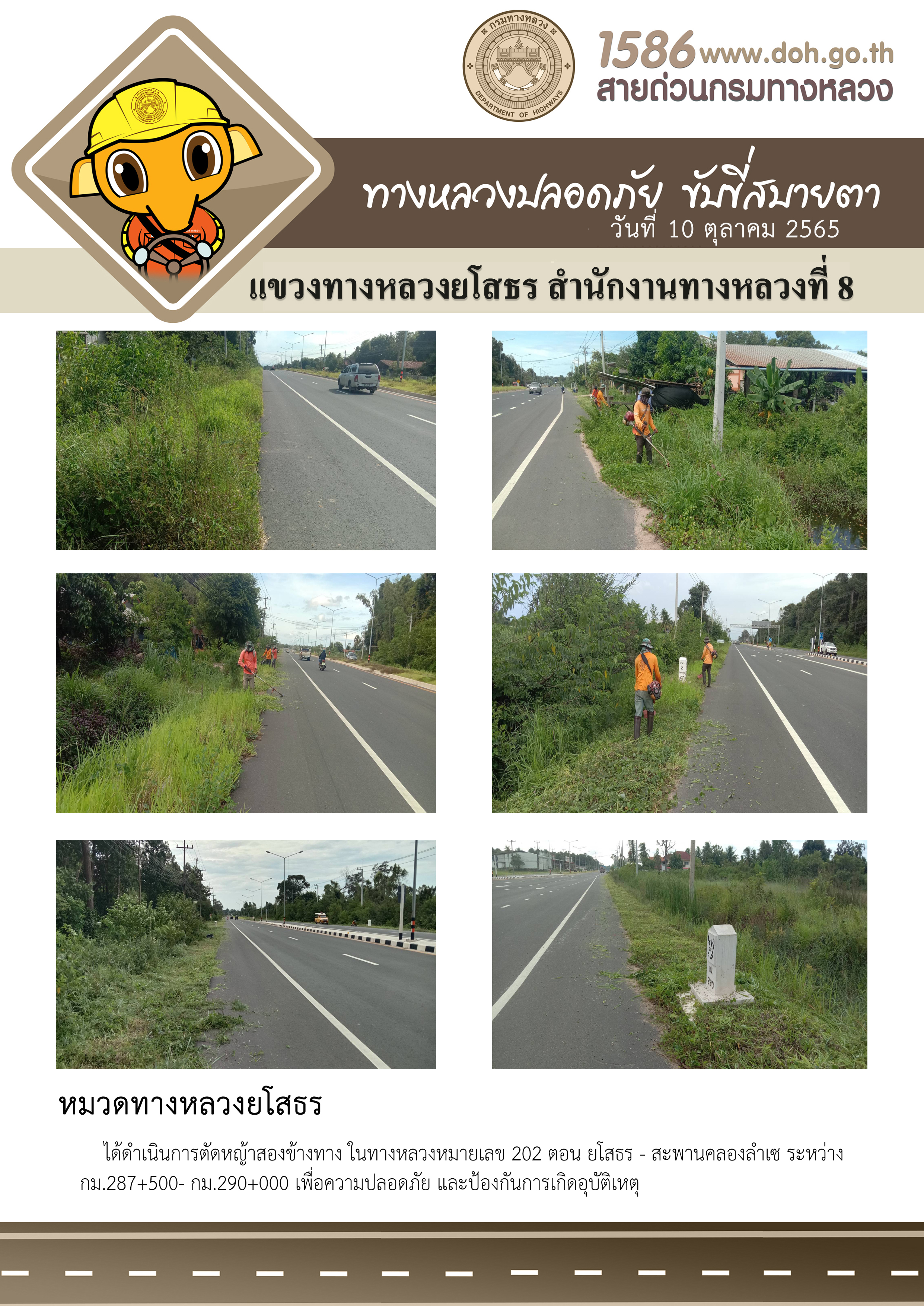 วันที่ 10 ตุลาคม 2565 หมวดทางหลวงยโสธร ได้ดำเนินการตัดหญ้าสองข้างทาง ในทางหลวงหมายเลข 202 ตอน ยโสธร - สะพานคลองลำเซ ระหว่าง กม.287+500- กม.290 +000 เพื่อความปลอดภัย และป้องกันการเกิดอุบัติเหตุ