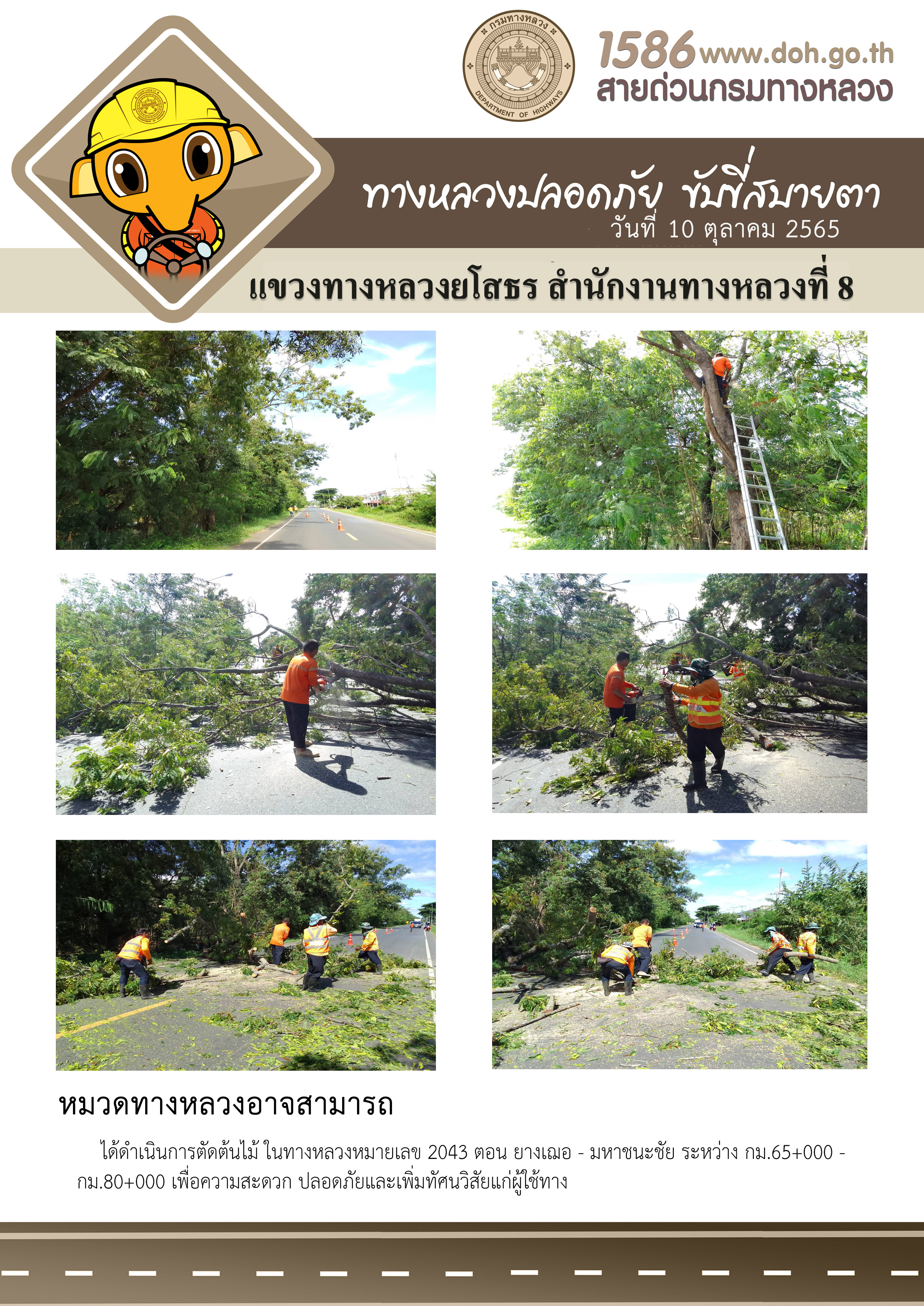 วันที่ 10 ตุลาคม 2565 หมวดทางหลวงอาจสามารถ ได้ดำเนินการตัดต้นไม้ ในทางหลวงหมายเลข 2043 ตอน ยางเฌอ - มหาชนะชัย ระหว่าง กม.65+000 - กม.80+000 เพื่อความสะดวก ปลอดภัยและเพิ่มทัศนวิสัยแก่ผู้ใช้ทาง