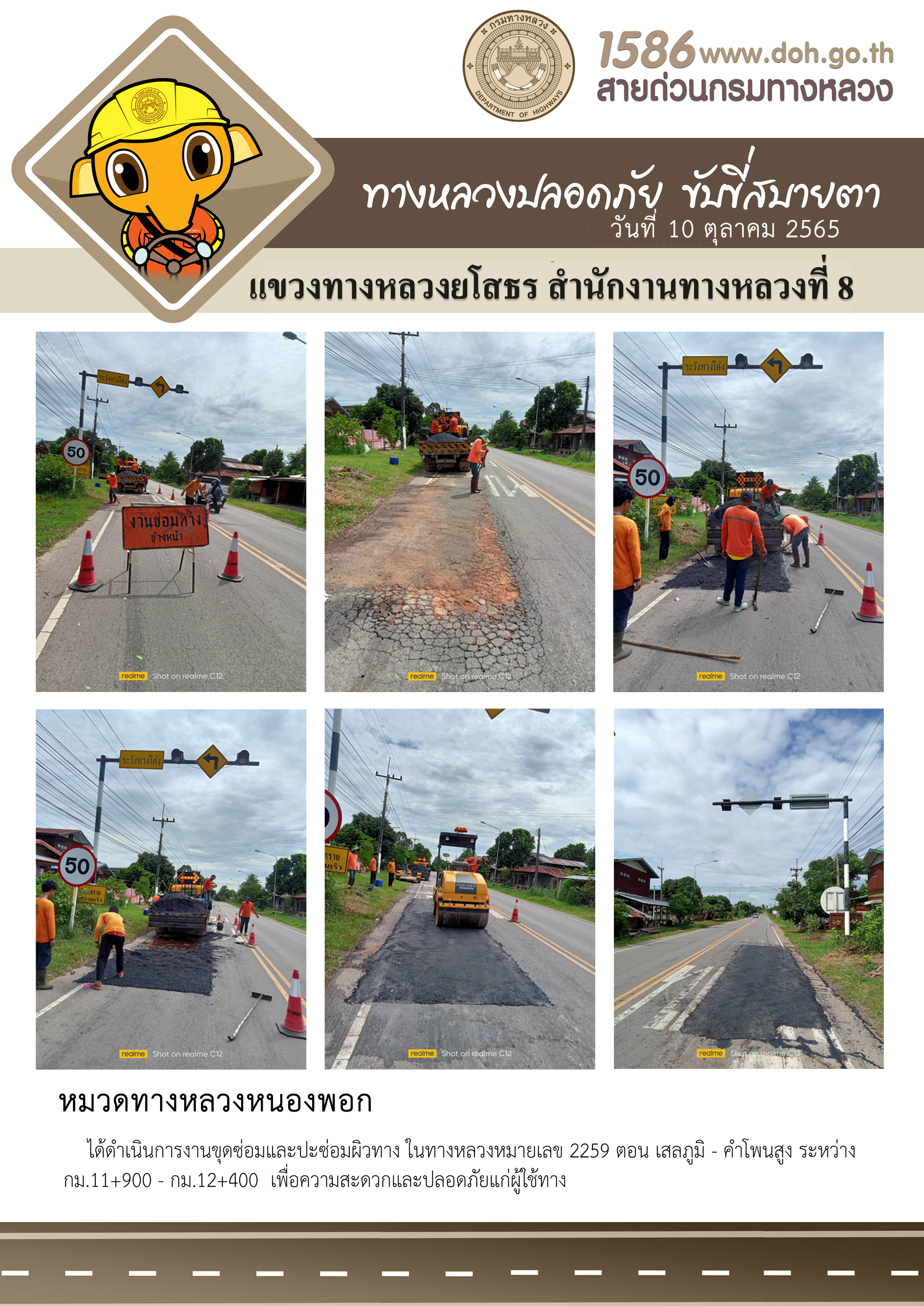 วันที่ 10 ตุลาคม 2565 หมวดทางหลวงหนองพอก ได้ดำเนินการงานขุดซ่อมและปะซ่อมผิวทาง ในทางหลวงหมายเลข 2259 ตอน เสลภูมิ - คำโพนสูง ระหว่าง กม.11+900 - กม.12+400 เพื่อความสะดวกและปลอดภัยแก่ผู้ใช้ทาง