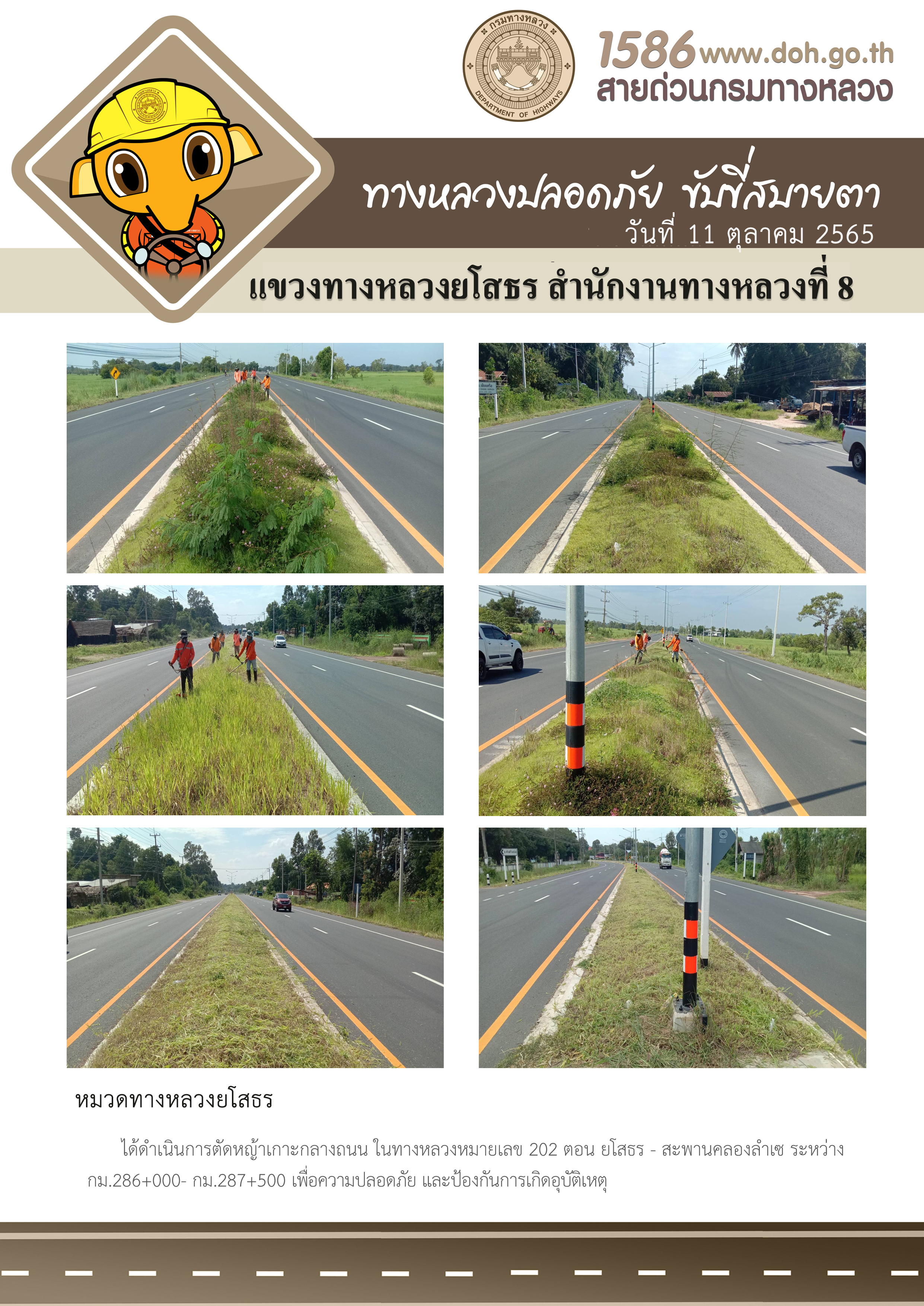 วันที่ 11 ตุลาคม 2565 หมวดทางหลวงยโสธร ได้ดำเนินการตัดหญ้าเกาะกลางถนน ในทางหลวงหมายเลข 202 ตอน ยโสธร - สะพานคลองลำเซ ระหว่าง กม.286+000 - กม.287+500 เพื่อความปลอดภัย และป้องกันการเกิดอุบัติเหตุ