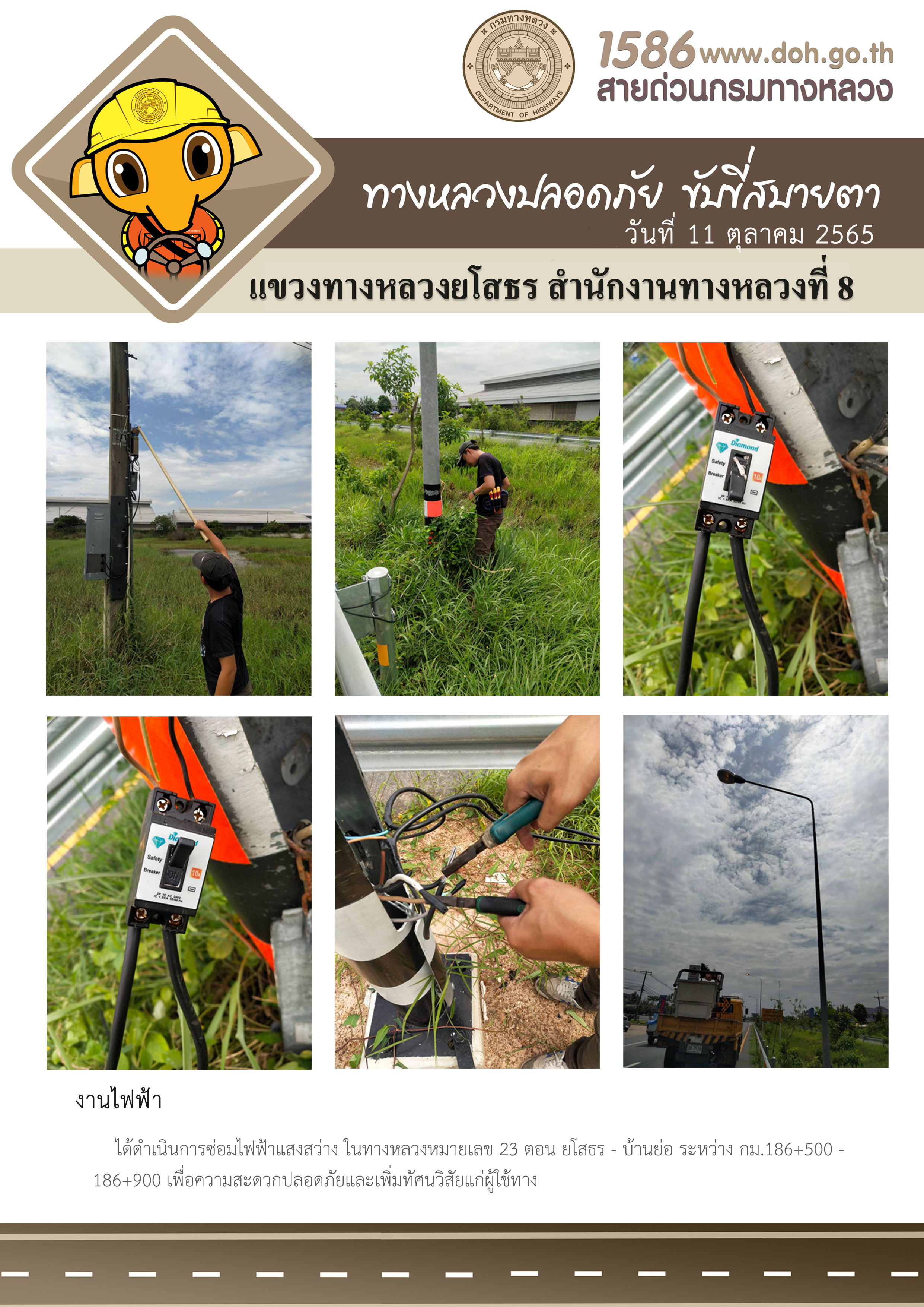 วันที่ 11 ตุลาคม 2565 งานไฟฟ้า ได้ดำเนินการซ่อมไฟฟ้าแสงสว่าง ในทางหลวงหมายเลข 23 ตอน ยโสธร - บ้านย่อ ระหว่าง กม.186+500 - 186+900 เพื่อความสะดวกปลอดภัยและเพิ่มทัศนวิสัยแก่ผู้ใช้ทาง