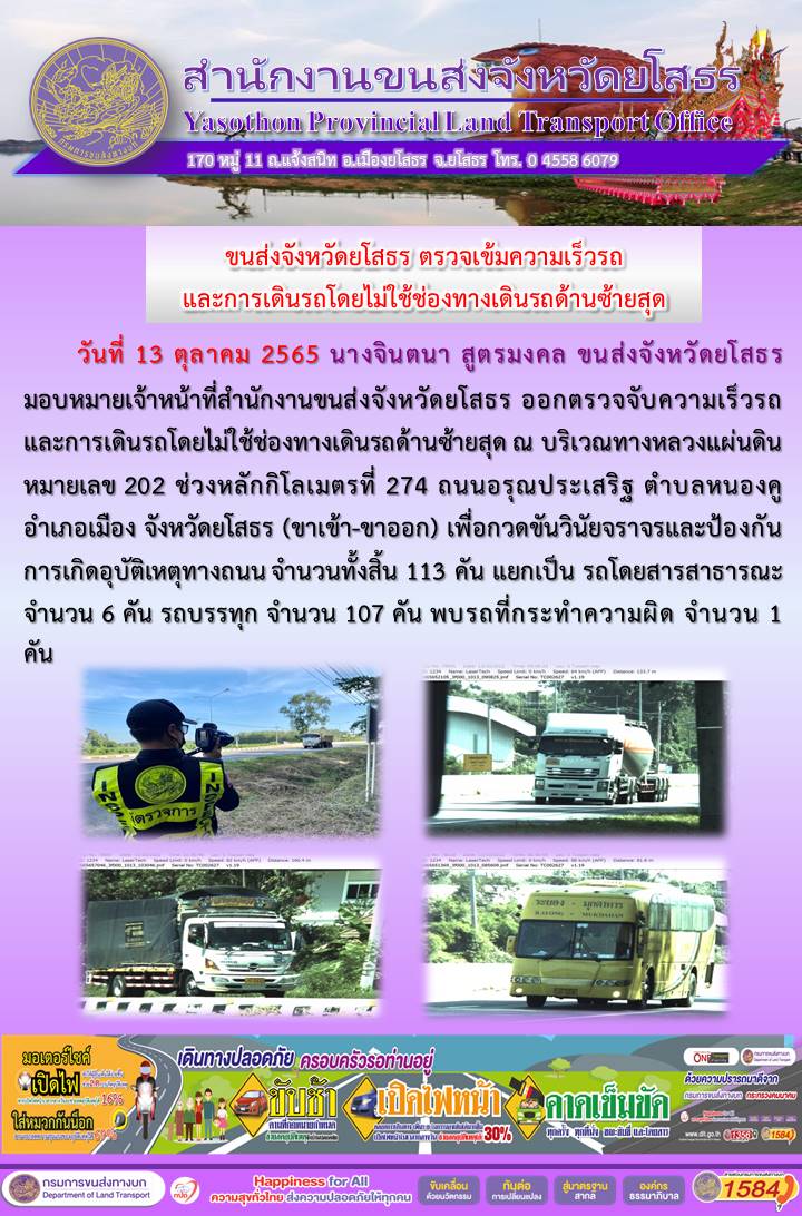 วันที่ 13 ตุลาคม 2565 เจ้าหน้าที่สำนักงานขนส่งจังหวัดยโสธร ออกตั้งจุดตรวจจับความเร็ว