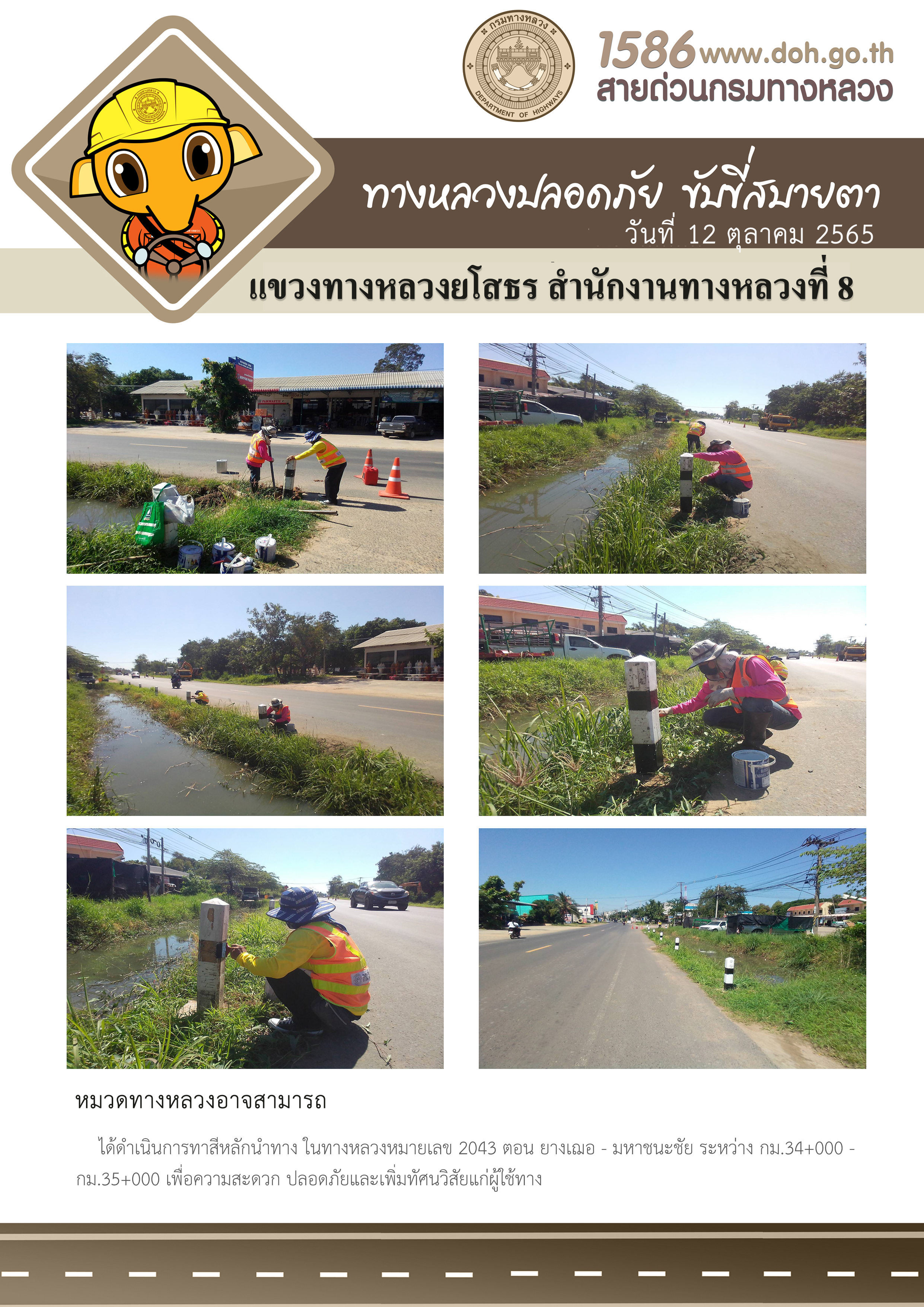วันที่ 12 ตลาคม 2565 หมวดทางหลวงอาจสามารถ ได้ดำเนินการทาสีหลักนำทาง ในทางหลวงหมายเลข 2043 ตอน ยางเฌอ - มหาชนะชัย ระหว่าง กม.34+000 - กม.35+000 เพื่อความสะดวกปลอดภัยและเพิ่มทัศนวิสัยแก่ผู้ใช้ทาง