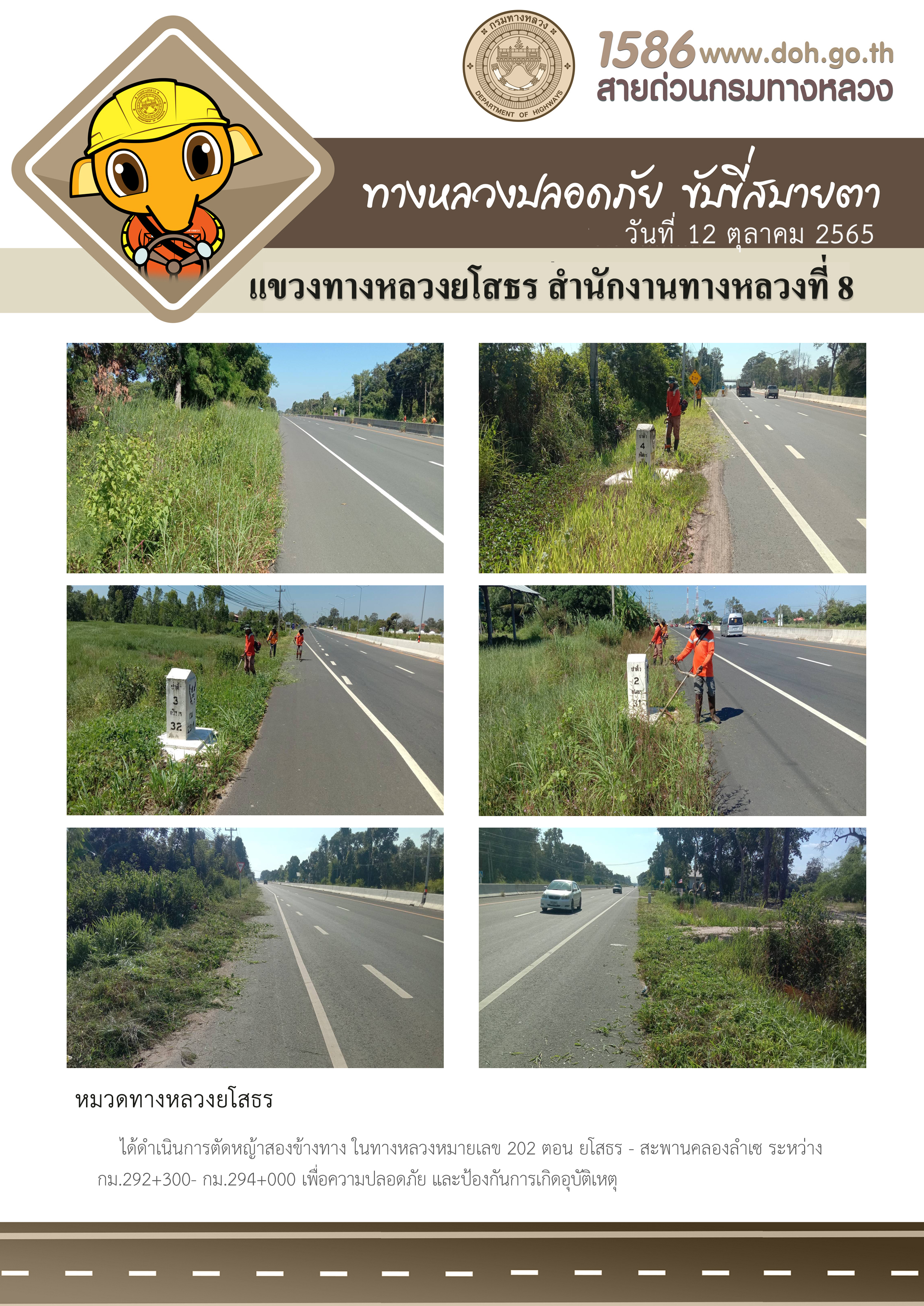 วันที่ 12 ตลาคม 2565 หมวดทางหลวงยโสธร ได้ดำเนินการตัดหญ้าสองข้างทาง ในทางหลวงหมายเลข 202 ตอน ยโสธร - สะพานคลองลำเซ ระหว่าง กม.292+300- กม.294+000 เพื่อความปลอดภัย และป้องกันการเกิดอุบัติเหตุ