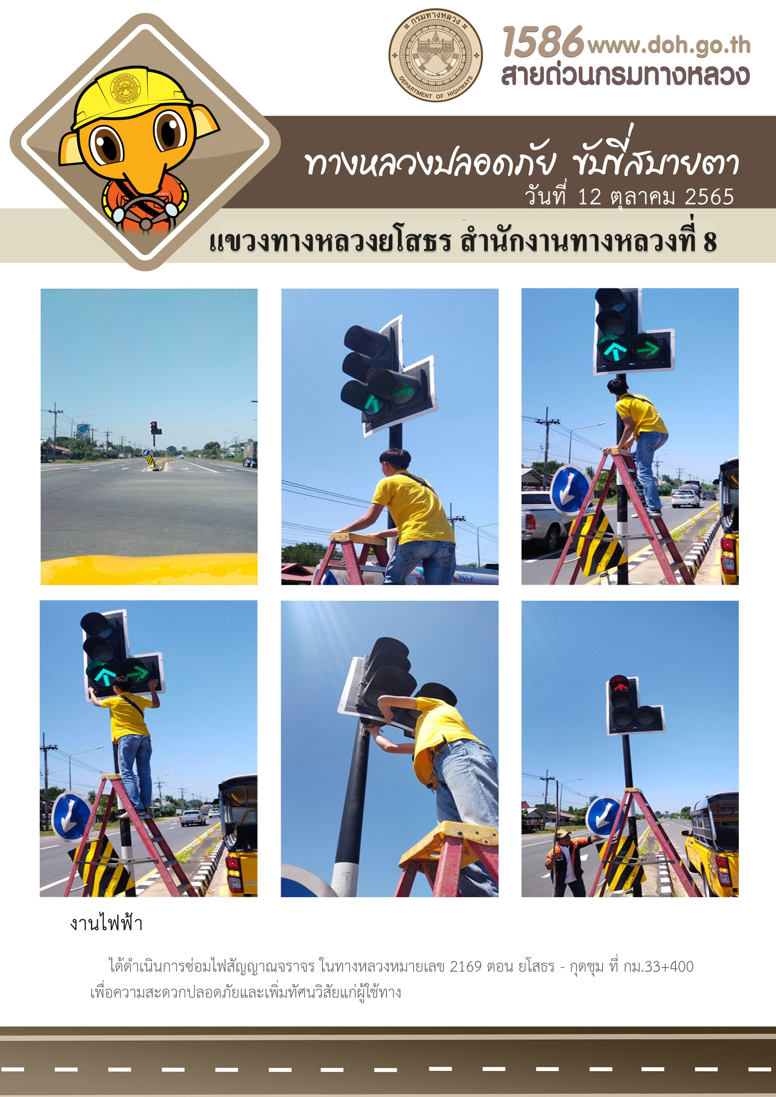 วันที่ 12 ตลาคม 2565 งานไฟฟ้า ได้ดำเนินการซ่อมไฟสัญญาณจราจร ในทางหลวงหมายเลข 2169 ตอน ยโสธร - กุดชุม ที่ กม.33+400 เพื่อความสะดวกปลอดภัยและเพิ่มทัศนวิสัยแก่ผู้ใช้ทาง