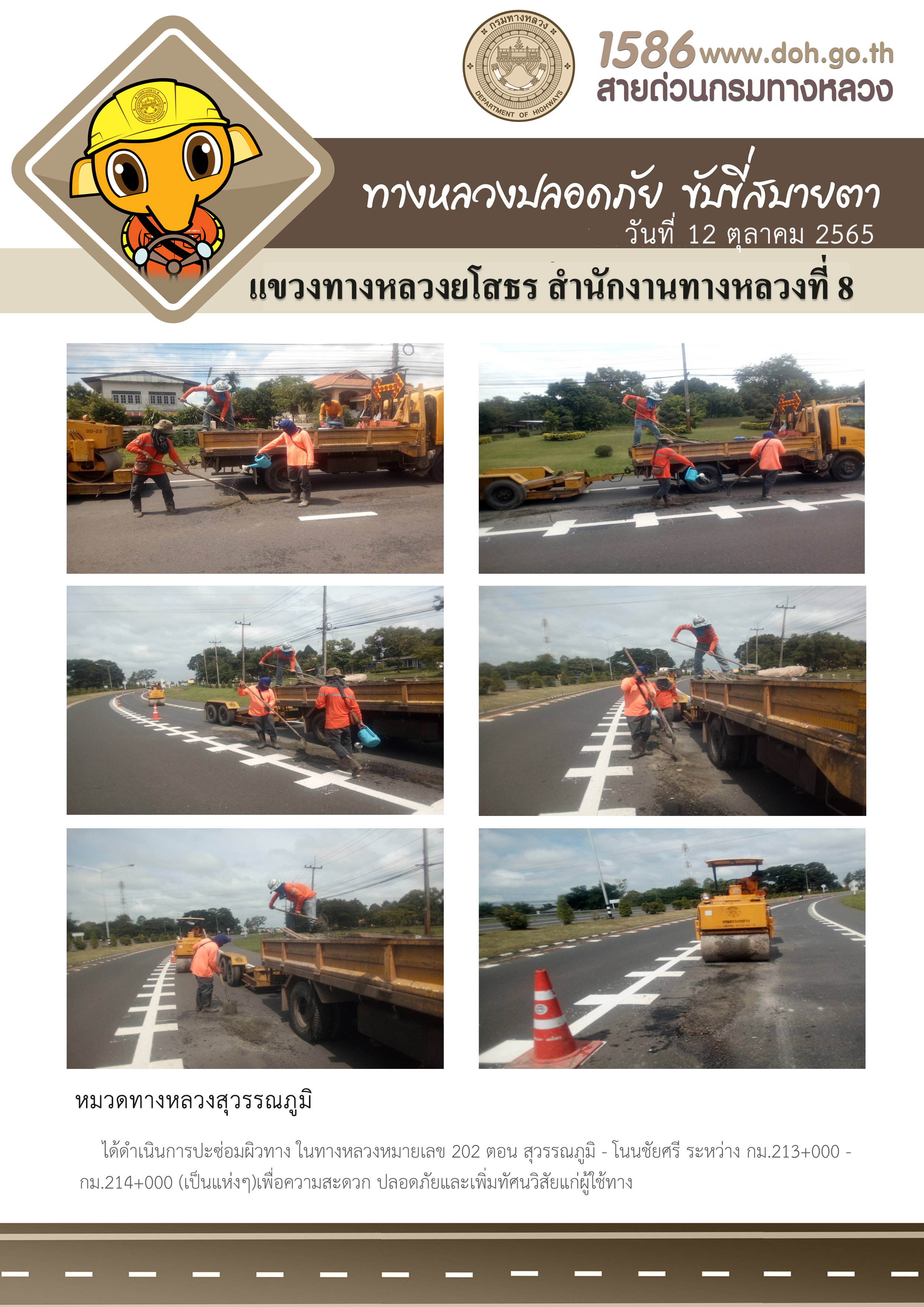 วันที่ 12 ตลาคม 2565 หมวดทางหลวงสุวรรณภูมิ ได้ดำเนินการปะซ่อมผิวทาง ในทางหลวงหมายเลข 202 ตอน สุวรรณภูมิ - โนนชัยศรี ระหว่าง กม.213+000 - กม.214+000 (เป็นแห่งๆ) เพื่อความสะดวก ปลอดภัยและเพิ่มทัศนวิสัยแก่ผู้ใช้ทาง