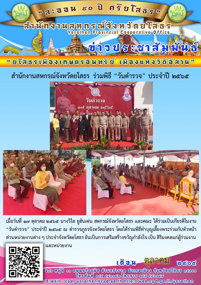 นางวิไล ยูฮันเซ่น สหกรณ์จังหวัดยโสธร และพร้อมด้วยเจ้าหน้าที่ ได้ร่วมเป็นเกียรติในงาน "วันตำรวจ" ประจำปี 2565 ณ ตำรวจภูธรจังหวัดยโสธร