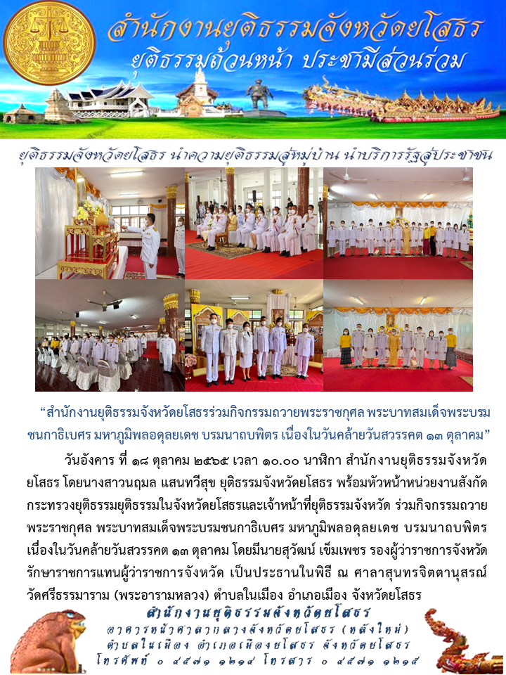 วันที่ 18 ต.ค. 2565 (15:02 น.)วันอังคาร ที่ ๑๘ ตุลาคม ๒๕๖๕ เวลา ๑๐.๐๐ นาฬิกา สำนักงานยุติธรรมจังหวัดยโสธร โดยนางสาวนฤมล แสนทวีสุข ยุติธรรมจังหวัดยโสธร พร้อมหัวหน้าหน่วยงานสังกัดกระทรวงยุติธรรมยุติธรรมในจังหวัดยโสธรและเจ้าหน้าที่ยุติธรรมจังหวัด ร่วมกิจกรรมถวายพระราชกุศล พระบาทสมเด็จพระบรมชนกาธิเบศร มหาภูมิพลอดุลยเดช บรมนาถบพิตร เนื่องในวันคล้ายวันสวรรคต ๑๓ ตุลาคม โดยมีนายสุวัฒน์ เข็มเพชร รองผู้ว่าราชการจังหวัด รักษาราชการแทนผู้ว่าราชการจังหวัด เป็นประธานในพิธี ณ ศาลาสุนทรจิตตานุสรณ์ วัดศรีธรรมาราม (พระอารามหลวง) ตำบลในเมือง อำเภอเมือง จังหวัดยโสธร