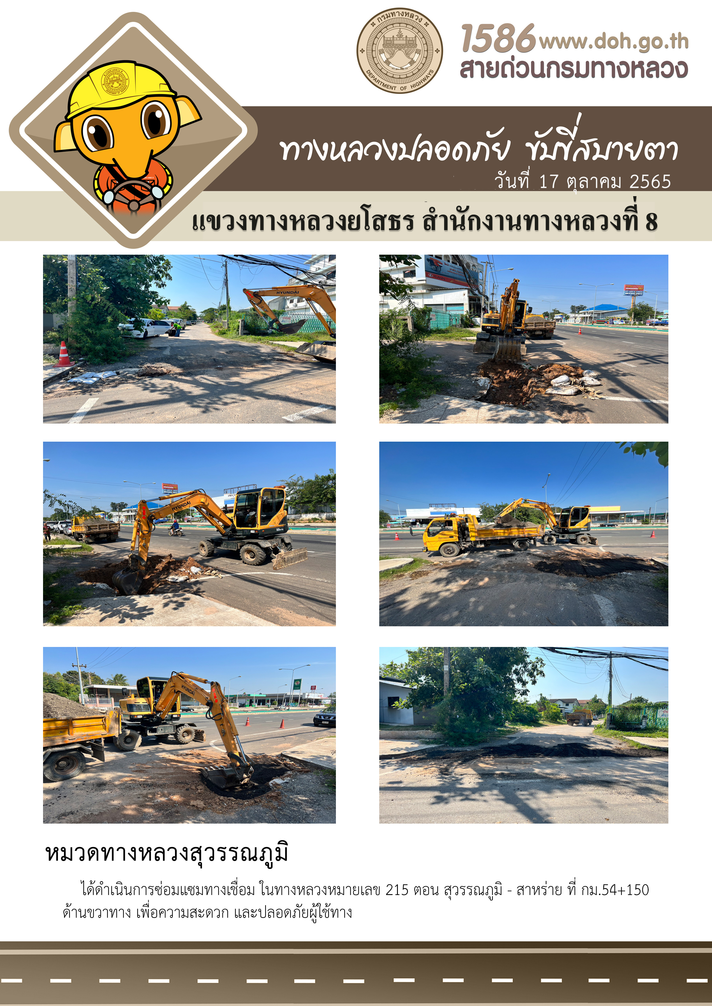 วันที่ 17 ตุลาคม 2565 หมวดทางหลวงสุวรรณภูมิ ได้ดำเนินการซ่อมแซมทางเชื่อม ในทางหลวงหมายเลข 215 ตอน สุวรรณภูมิ - สาหร่าย ที่ กม.54+150 ด้านขวาทาง เพื่อความสะดวก และปลอดภัยแก่ผู้ใช้ทาง