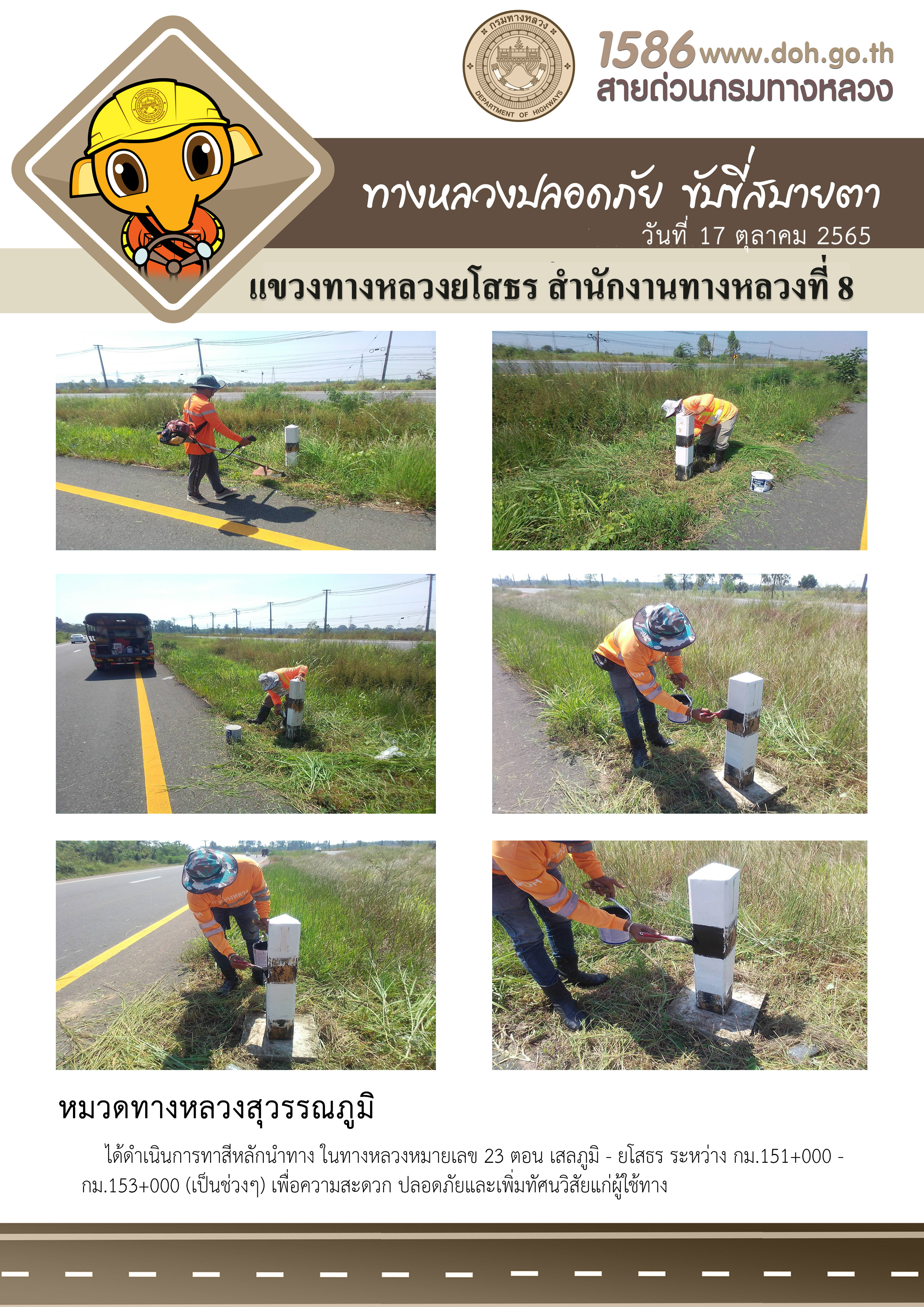 วันที่ 17 ตุลาคม 2565 หมวดทางหลวงสุวรรณภูมิ ได้ดำเนินการทาสีหลักนำทาง ในทางหลวงหมายเลข 23 ตอน เสลภูมิ - ยโสธร ระหว่าง กม.151+000 - กม.153+000 (เป็นช่วงๆ) เพื่อความสะดวก ปลอดภัยและเพิ่มทัศนวิสัยแก่ผู้ใช้ทาง