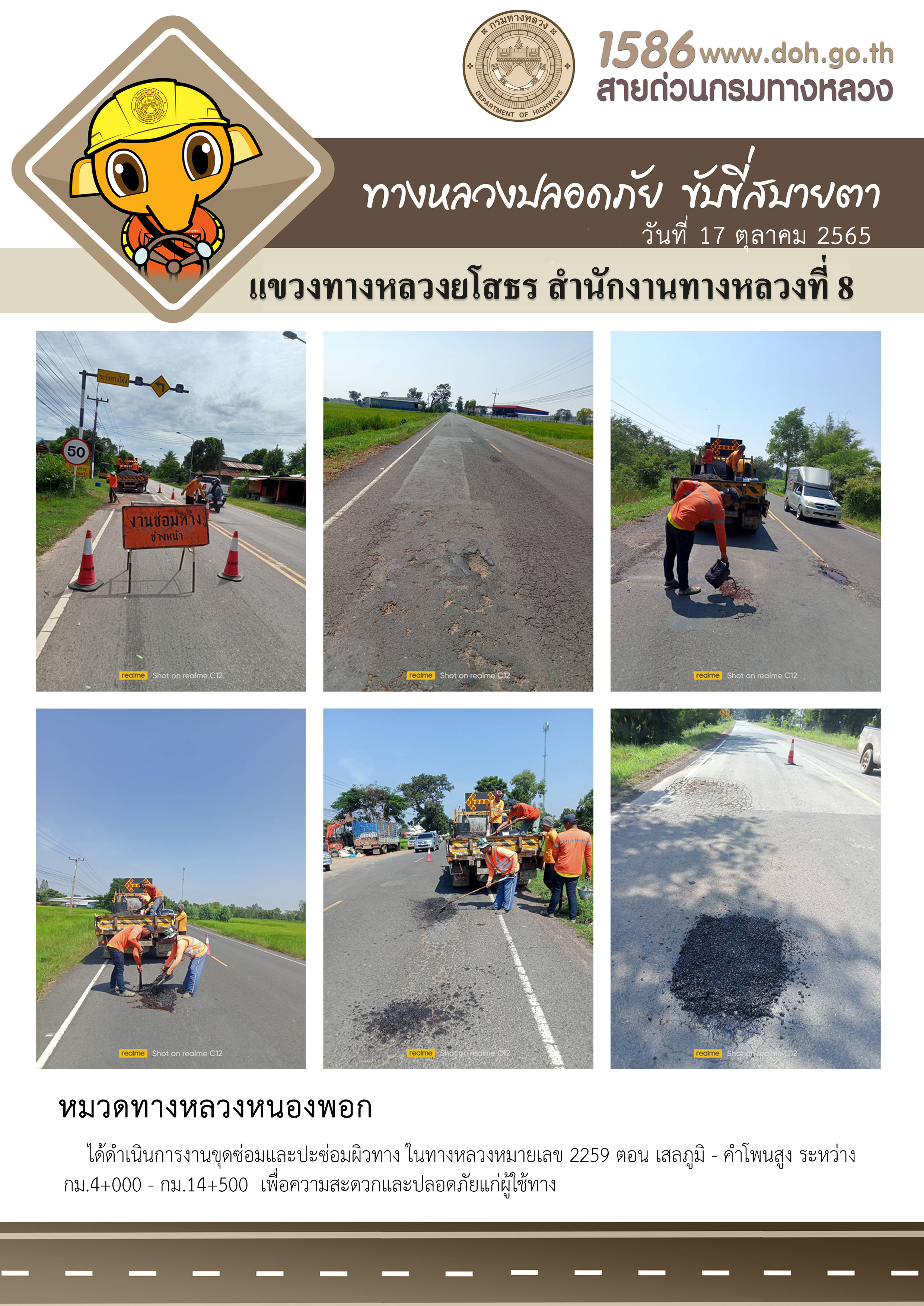 วันที่ 17 ตุลาคม 2565 หมวดทางหลวงหนองพอก ได้ดำเนินการงานขุดซ่อมและปะซ่อมผิวทาง ในทางหลวงหมายเลข 2259 ตอน เสลภูมิ - คำโพนสูง ระหว่าง กม.4+000 - กม.14+500 เพื่อความสะดวกและปลอดภัยแก่ผู้ใช้ทาง