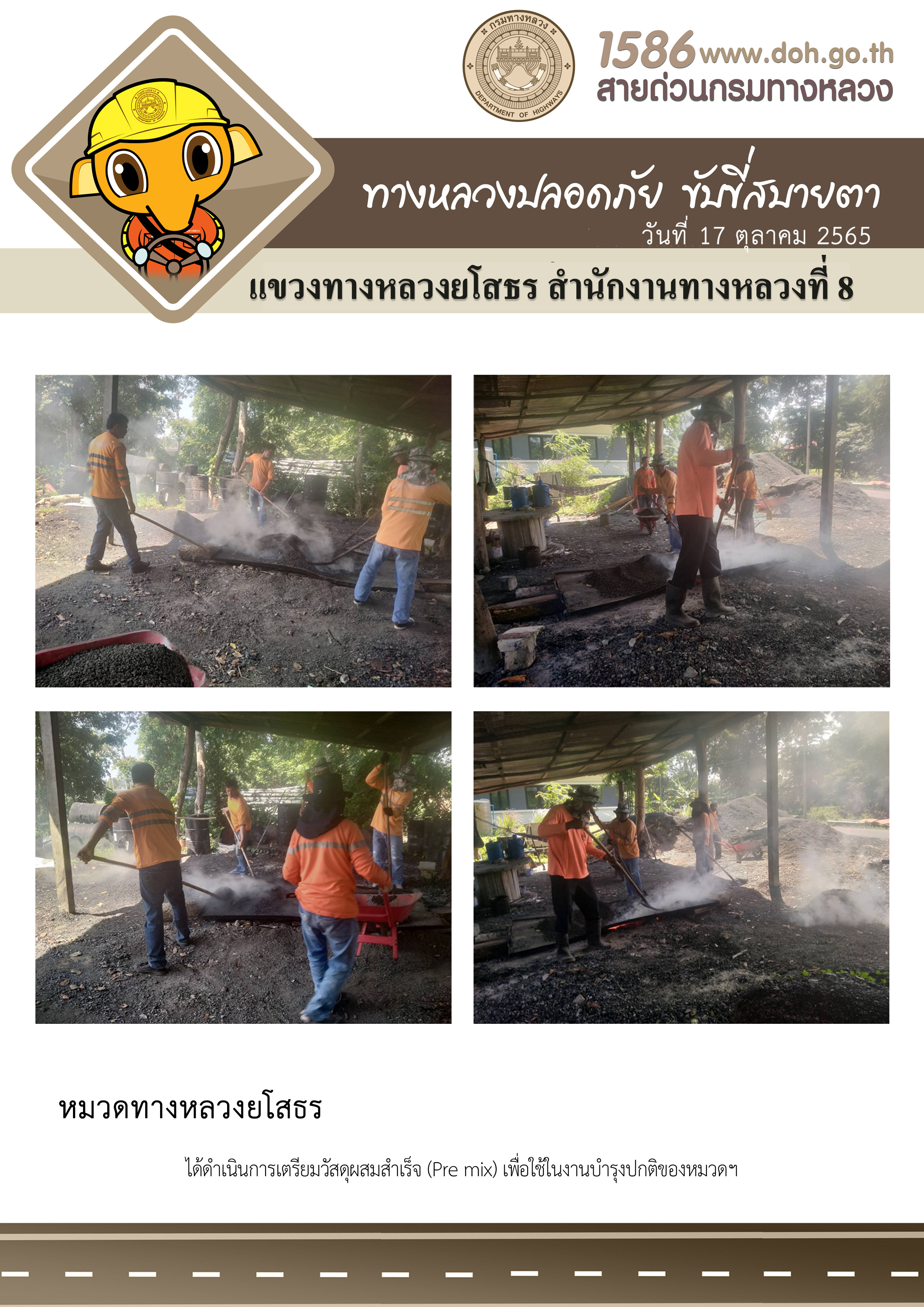 วันที่ 17 ตุลาคม 2565 หมวดทางหลวงยโสธร ได้ดำเนินการเตรียมวัสดุผสมสำเร็จ (Pre mix) เพื่อใช้ในงานบำรุงปกติของหมวดฯ