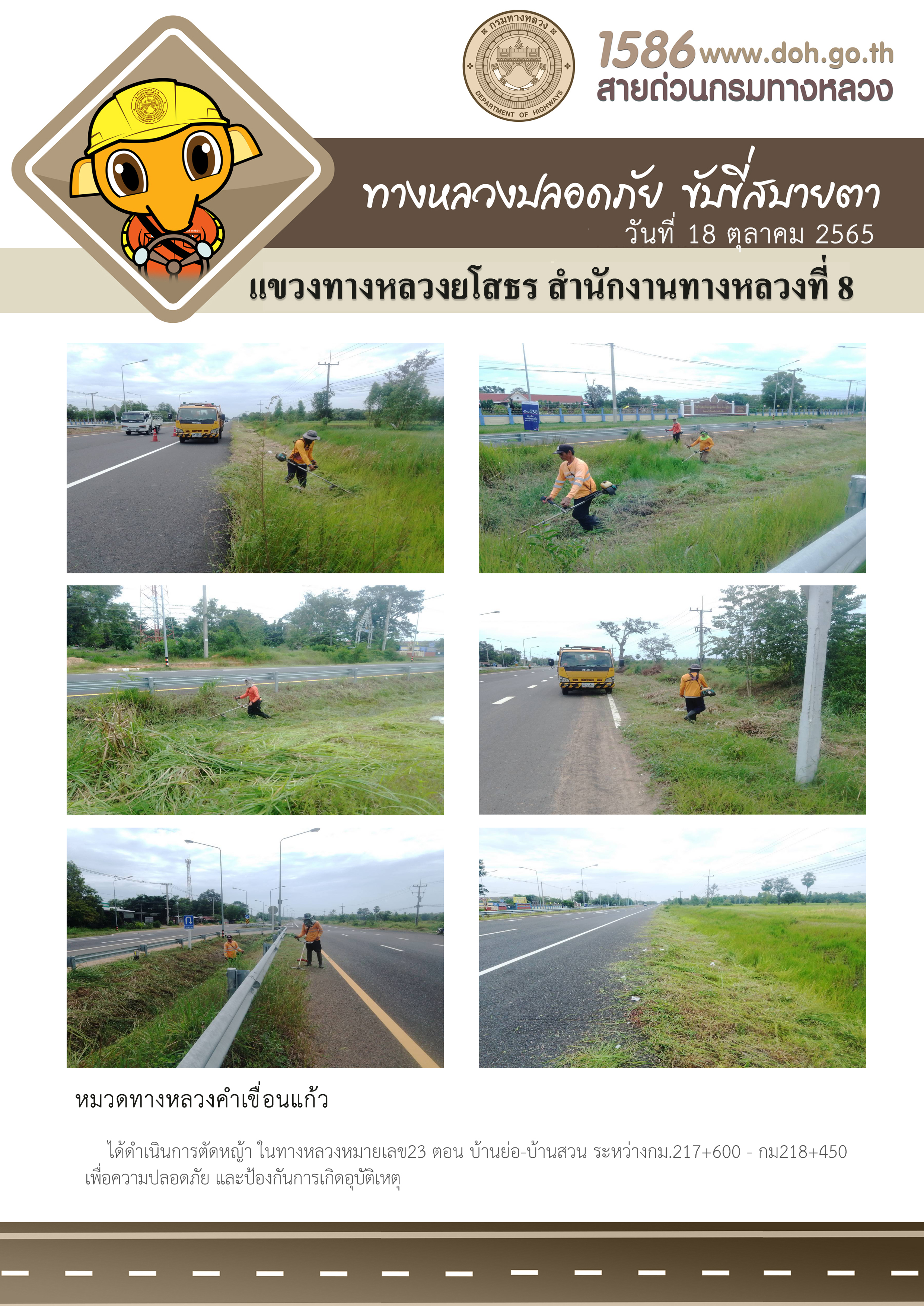 วันที่ 18 ตุลาคม 2565 หมวดทางหลวงคำเขื่อนแก้ว ได้ดำเนินการตัดหญ้า ในทางหลวงหมายเลข23 ตอน บ้านย่อ-บ้านสวน ระหว่างกม.217+600 - กม218+450 เพื่อความปลอดภัย และป้องกันการเกิดอุบัติเหตุ
