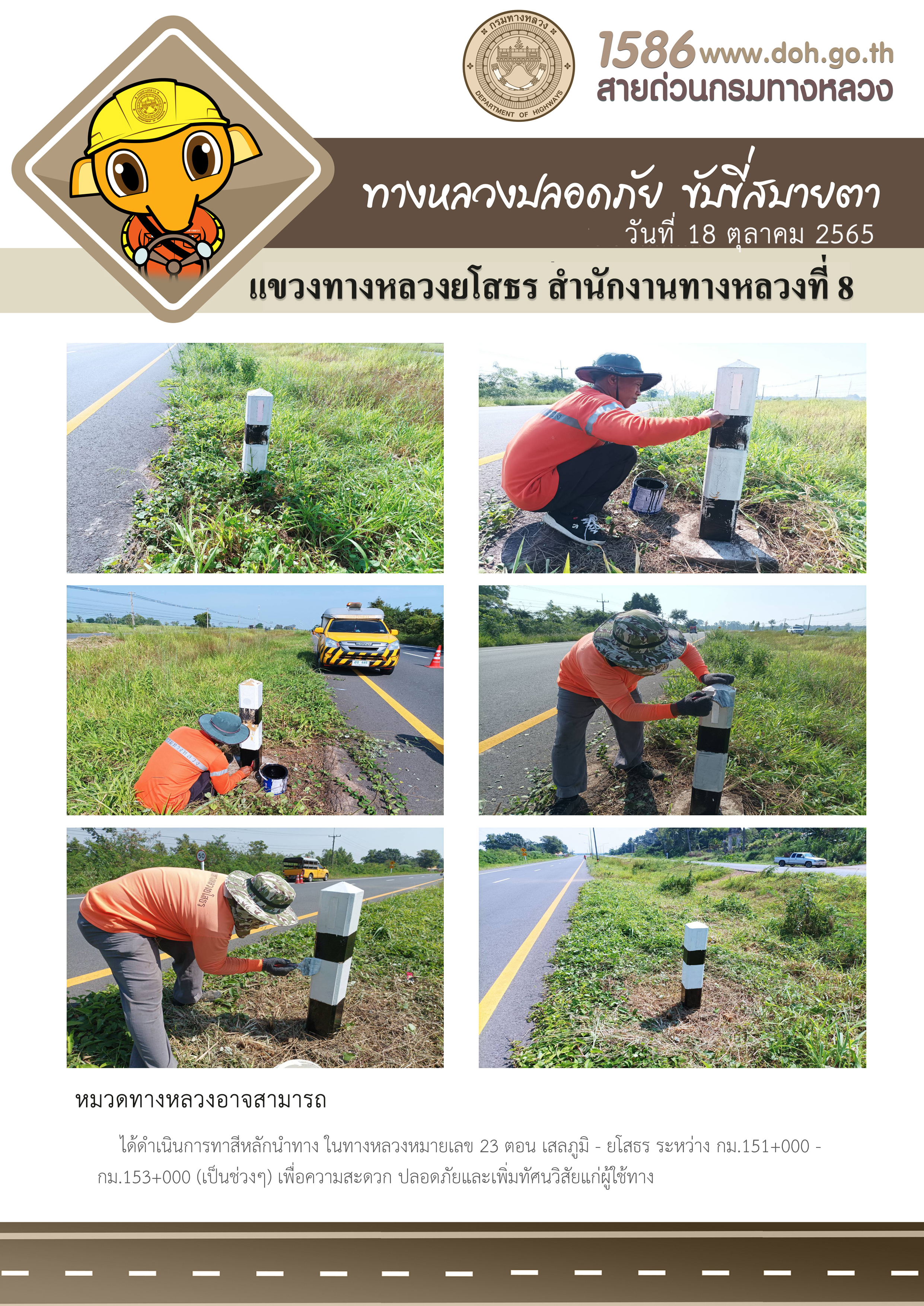 - [15:24] ทั่วไป วันจันทร์ที่ 20 เมษายน 2569 หมวดทางหลวงยโสธร ได้ดำเนินการถอดแบบพร้อมติดตั้งแบบเกาะกลางถนน ในทางหลวงหมายเลข 2169 ตอน ยโสธร - กุดชุม ระหว่าง กม.3+000 - กม.3+400 เพื่อความสะดวกปลอดภัย และเพิ่มทัศนวิสัยแก่ผู้ใช้ทาง