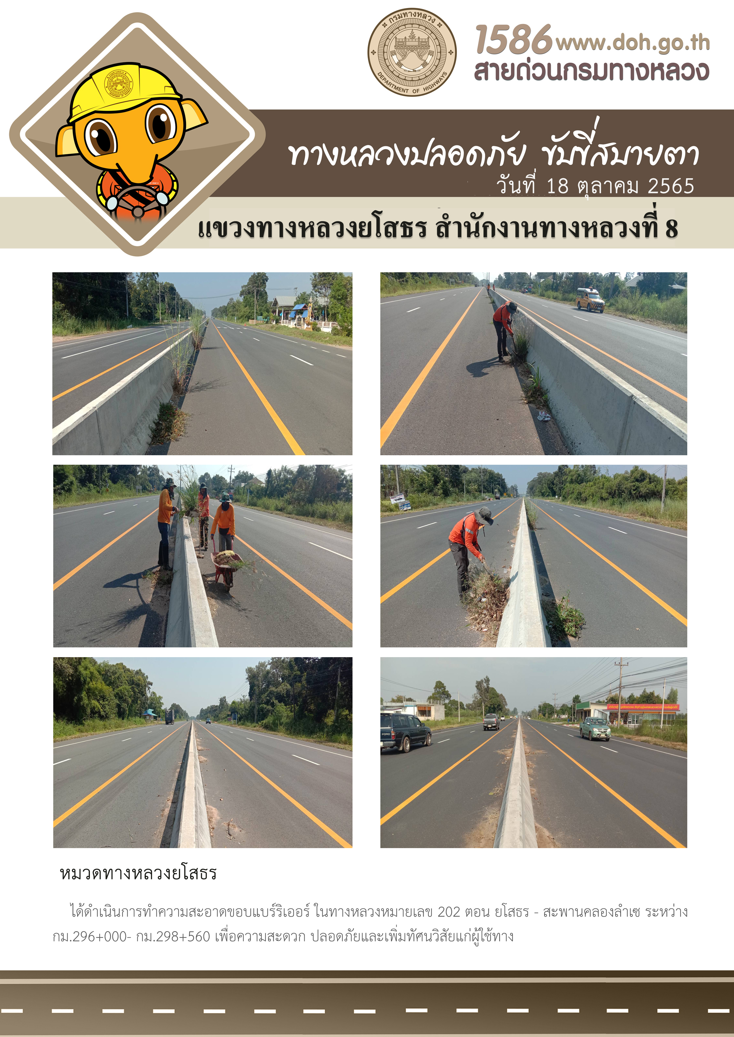 วันที่ 18 ตุลาคม 2565 หมวดทางหลวงยโสธร ได้ดำเนินการทำความสะอาดขอบแบร์ริเออร์ ในทางหลวงหมายเลข 202 ตอน ยโสธร - สะพานคลองลำเซ ระหว่าง กม.296+000 - กม.298+560 เพื่อความสะดวก ปลอดภัยและเพิ่มทัศนวิสัยแก่ผู้ใช้ทาง