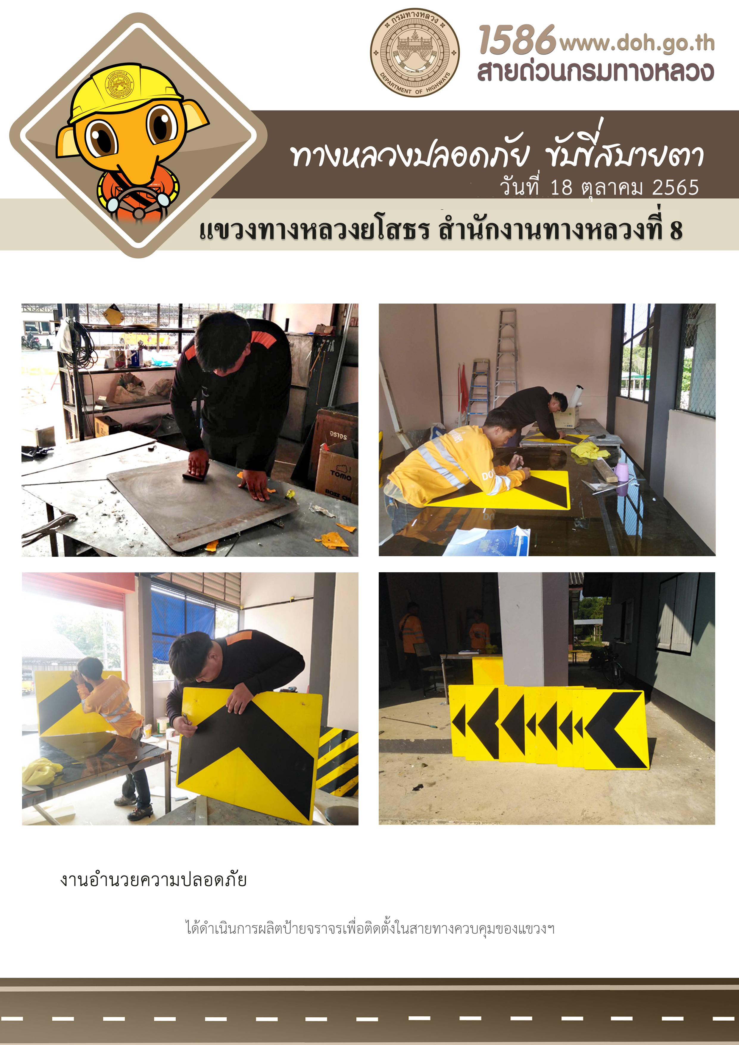 วันที่ 18 ตุลาคม 2565 งานอำนวยความปลอดภัย ได้ดำเนินการผลิตป้ายจราจรเพื่อติดตั้งในสายทางควบคุมของแขวงฯ