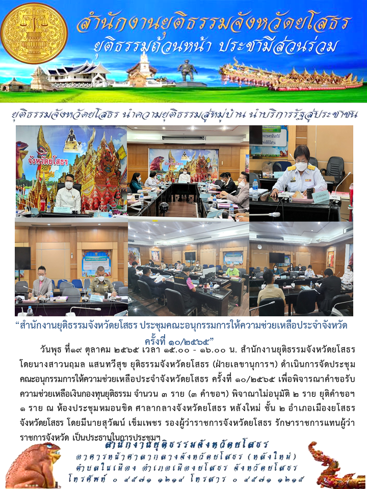 วันที่ 20 ต.ค. 2565 (10:36 น.)วันพุธ ที่ ๑๙ ตุลาคม 2565 เวลา ๑๕.๐๐ - ๑๖.๐๐ น. สำนักงานยุติธรรมจังหวัดยโสธรโดยนางสาวนฤมล แสนทวีสุข ยุติธรรมจังหวัดยโสธร (ฝ่ายเลขานุการฯ) ดำเนินการจัดประชุมคณะอนุกรรมการให้ความช่วยเหลือประจำจังหวัดยโสธร ครั้งที่ ๑๐/๒๕๖๕ เพื่อพิจารณาคำขอรับความช่วยเหลือเงินกองทุนยุติธรรม จำนวน ๓ ราย (๓ คำขอฯ) พิจาณาไม่อนุมัติ ๒ ราย ยุติคำขอฯ ๑ ราย ณ ห้องประชุมหมอนขิด ศาลากลางจังหวัดยโสธร หลังใหม่ ชั้น ๒ อำเภอเมืองยโสธร จังหวัดยโสธร โดยมีนายสุวัฒน์ เข็มเพชร รองผู้ว่าราชการจังหวัดยโสธร รักษาราชการแทนผู้ว่าราชการจังหวัด เป็นประธานในการประชุมฯ