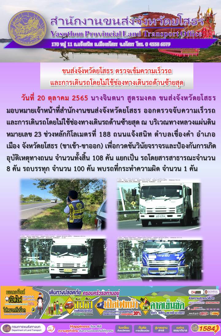 วันที่ 20 ตุลาคม 2565 เจ้าหน้าที่สำนักงานขนส่งจังหวัดยโสธร ออกตั้งจุดตรวจจับความเร็ว