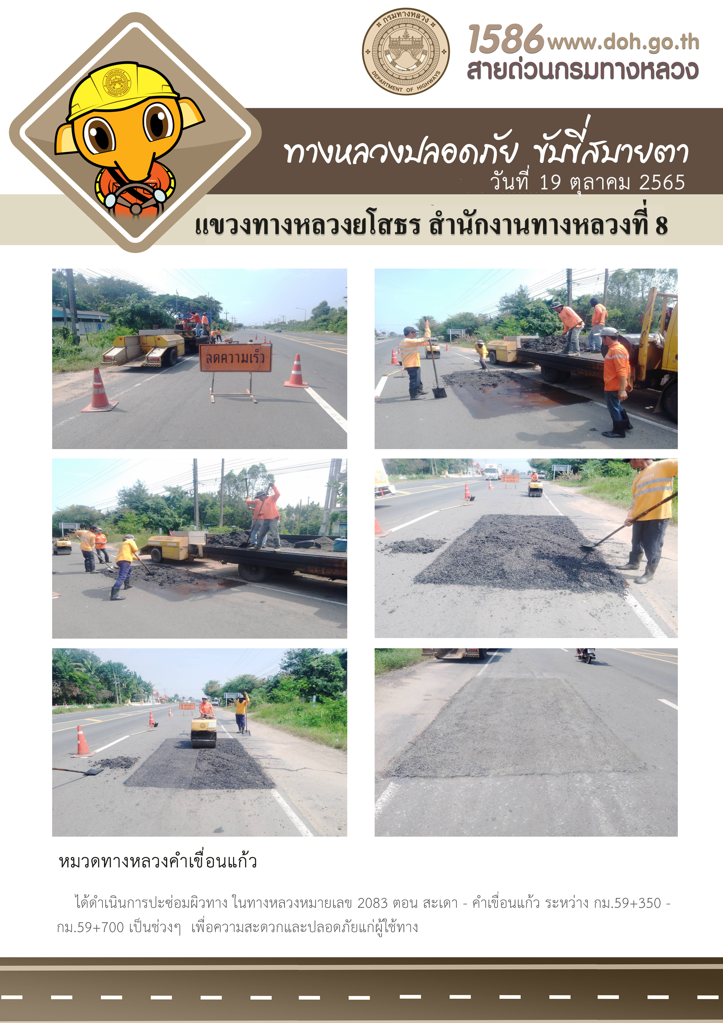 วันที่ 19 ตุลาคม 2565 หมวดทางหลวงคำเขื่อนแก้ว ได้ดำเนินการปะซ่อมผิวทาง ในทางหลวงหมายเลข 2083 ตอน สะเดา - คำเขื่อนแก้ว ระหว่าง กม.59+350 - กม.59+700 เป็นช่วงๆ เพื่อความสะดวกและปลอดภัยแก่ผู้ใช้ทาง