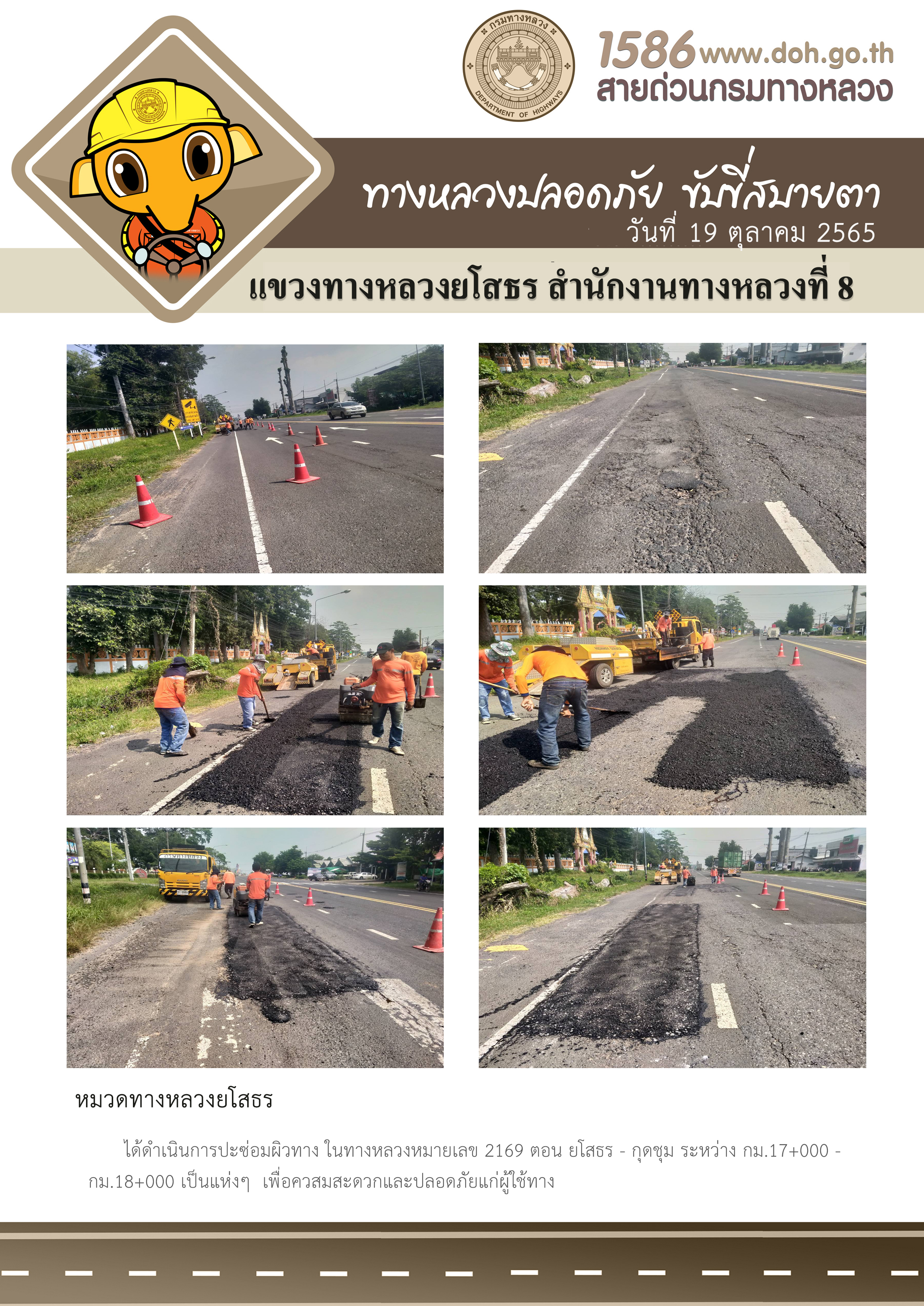 วันที่ 19 ตุลาคม 2565 หมวดทางหลวงยโสธร ได้ดำเนินการปะซ่อมผิวทาง ในทางหลวงหมายเลข 2169 ตอน ยโสธร - กุดชุม ระหว่าง กม.17+000 - กม. 18+000 เป็นแห่งๆ เพื่อความสะดวกและปลอดภัยแก่ผู้ใช้ทาง