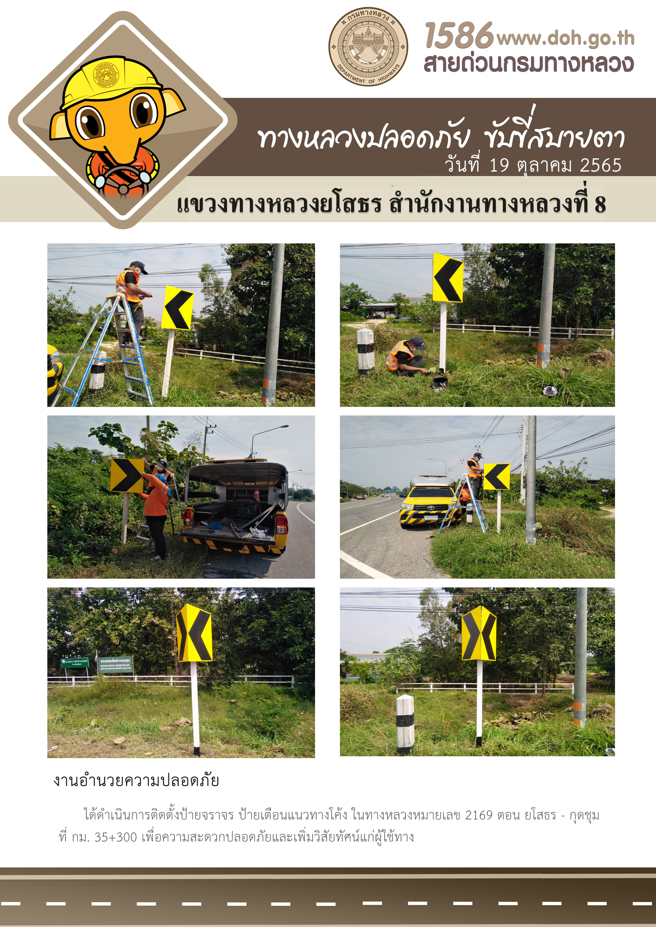 วันที่ 19 ตุลาคม 2565 งานอำนวยความปลอดภัย ได้ดำเนินการติดตั้งป้ายจราจร ป้ายเตือนแนวทางโค้ง ในทางหลวงหมายเลข 2169 ตอน ยโสธร - กุดชุม ที่ กม. 35+300 เพื่อความสะดวกปลอดภัยและเพิ่มวิสัยทัศน์แก่ผู้ใช้ทาง