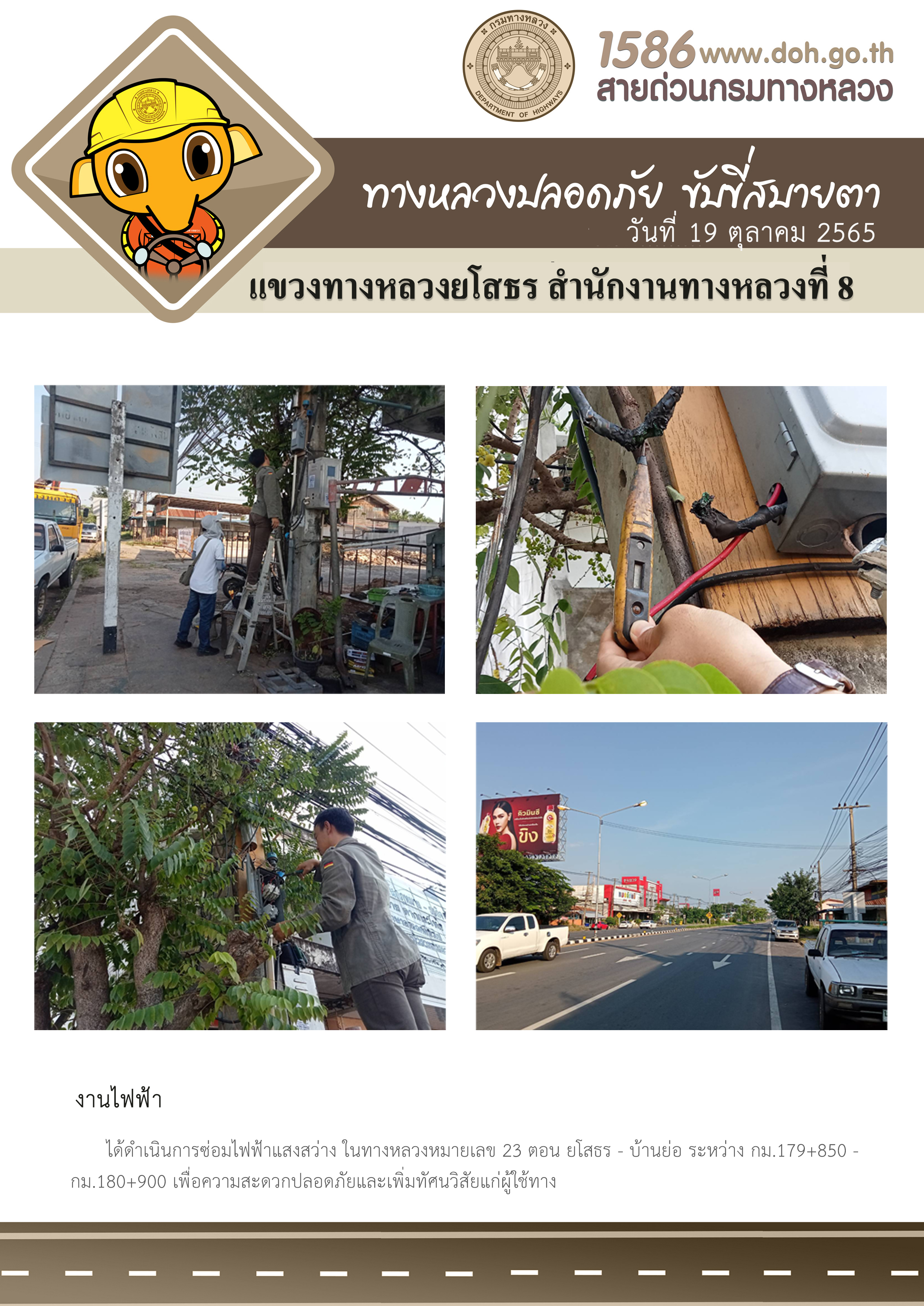 วันที่ 19 ตุลาคม 2565 งานไฟฟ้า ได้ดำเนินการซ่อมไฟฟ้าแสงสว่าง ในทางหลวงหมายเลข 23 ตอน ยโสธร - บ้านย่อ ระหว่าง กม.179+850 - กม.180+900 เพื่อความสะดวกปลอดภัยและเพิ่มทัศนวิสัยแก่ผู้ใช้ทาง