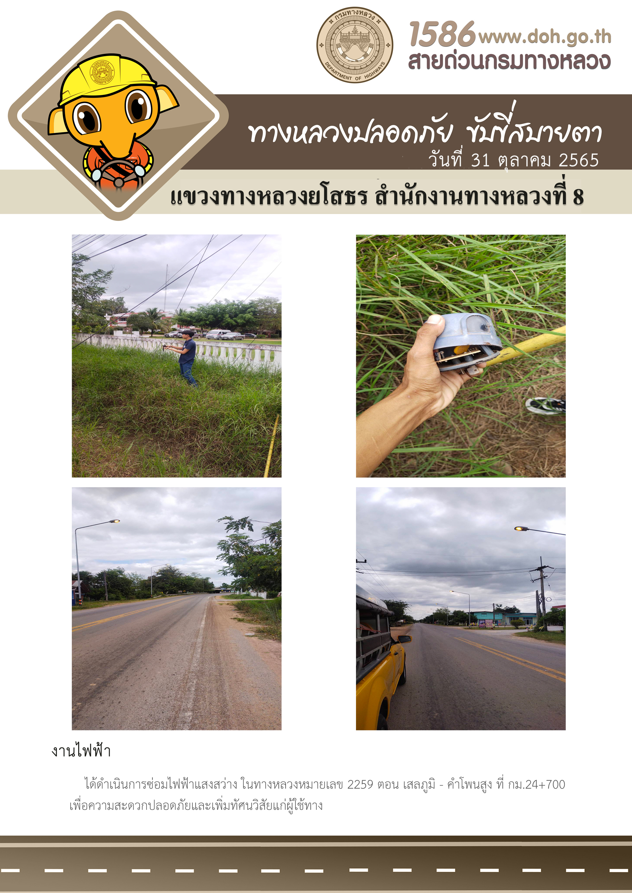 วันที่ 31 ตุลาคม 2565 งานไฟฟ้า ได้ดำเนินการซ่อมไฟฟ้าแสงสว่าง ในทางหลวงหมายเลข 2259 ตอน เสลภูมิ - คำโพนสูง ที่ กม.24+700 เพื่อความสะดวกปลอดภัยและเพิ่มทัศนวิสัยแก่ผู้ใช้ทาง