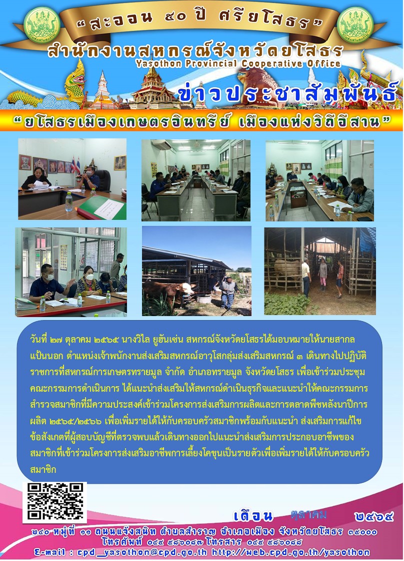 เจ้าหน้าที่สำนักงานสหกรณ์จังหวัดยโสธร เข้าร่วมประชุมคณะกรรมการดำเนินการได้แนะนำส่งเสริมให้สหกรณ์ดำเนินธุรกิจและแนะนำให้คณะกรรมการสำรวจสมาชิกที่มีความประสงค์เข้าร่วมโครงการส่งเสริมการผลิตและการตลาดพืชหลังนาปีการผลิต 2565/2566 ณ สกก.ทรายมูล จำกัด