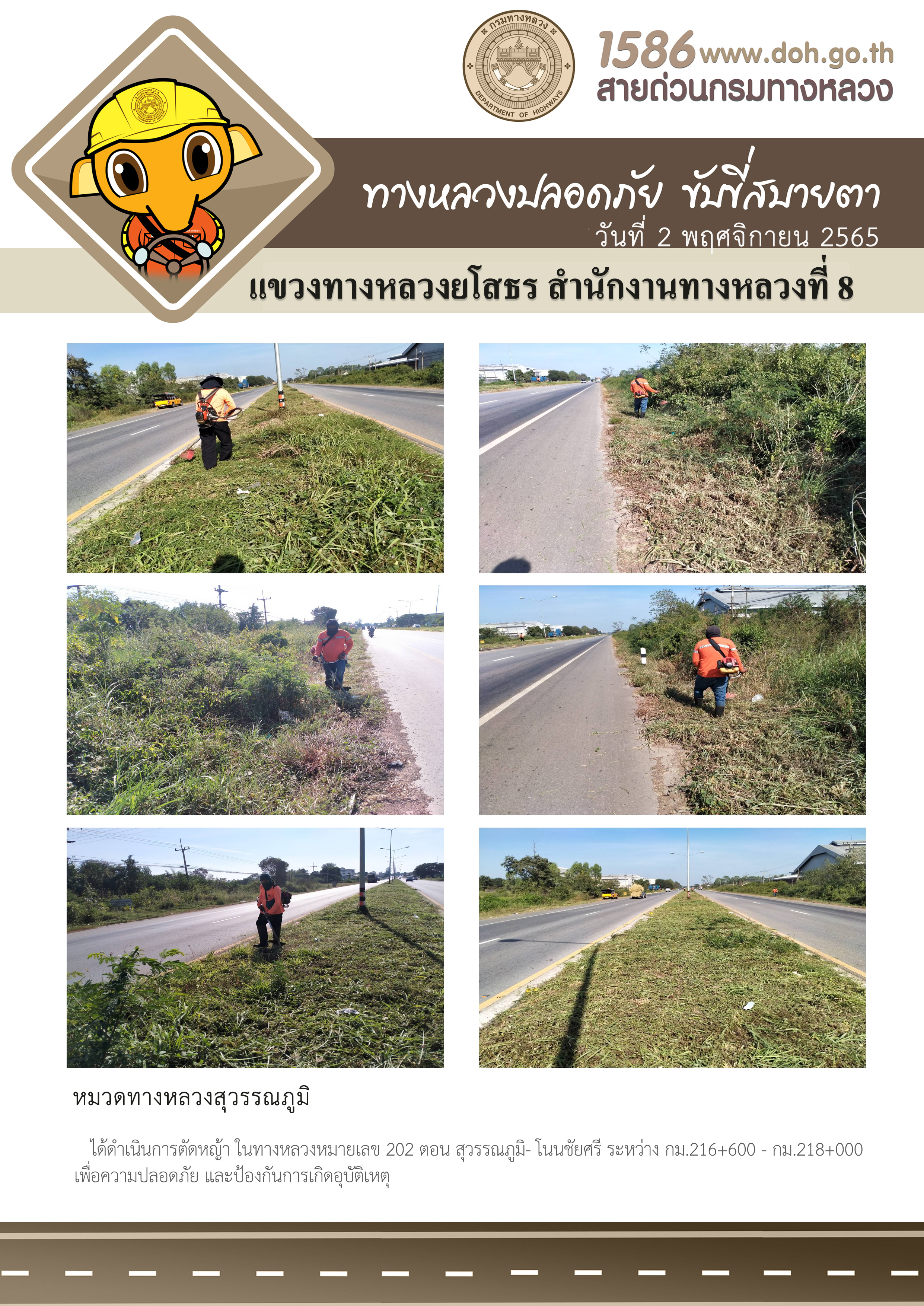 วันที่ 2 พฤศจิกายน 2565 หมวดทางหลวงสุวรรณภูมิ ได้ดำเนินการตัดหญ้า ในทางหลวงหมายเลข 202 ตอน สุวรรณภูมิ- โนนชัยศรี ระหว่าง กม.216+600 - กม.218+000 เพื่อความปลอดภัย และป้องกันการเกิดอุบัติเหตุ