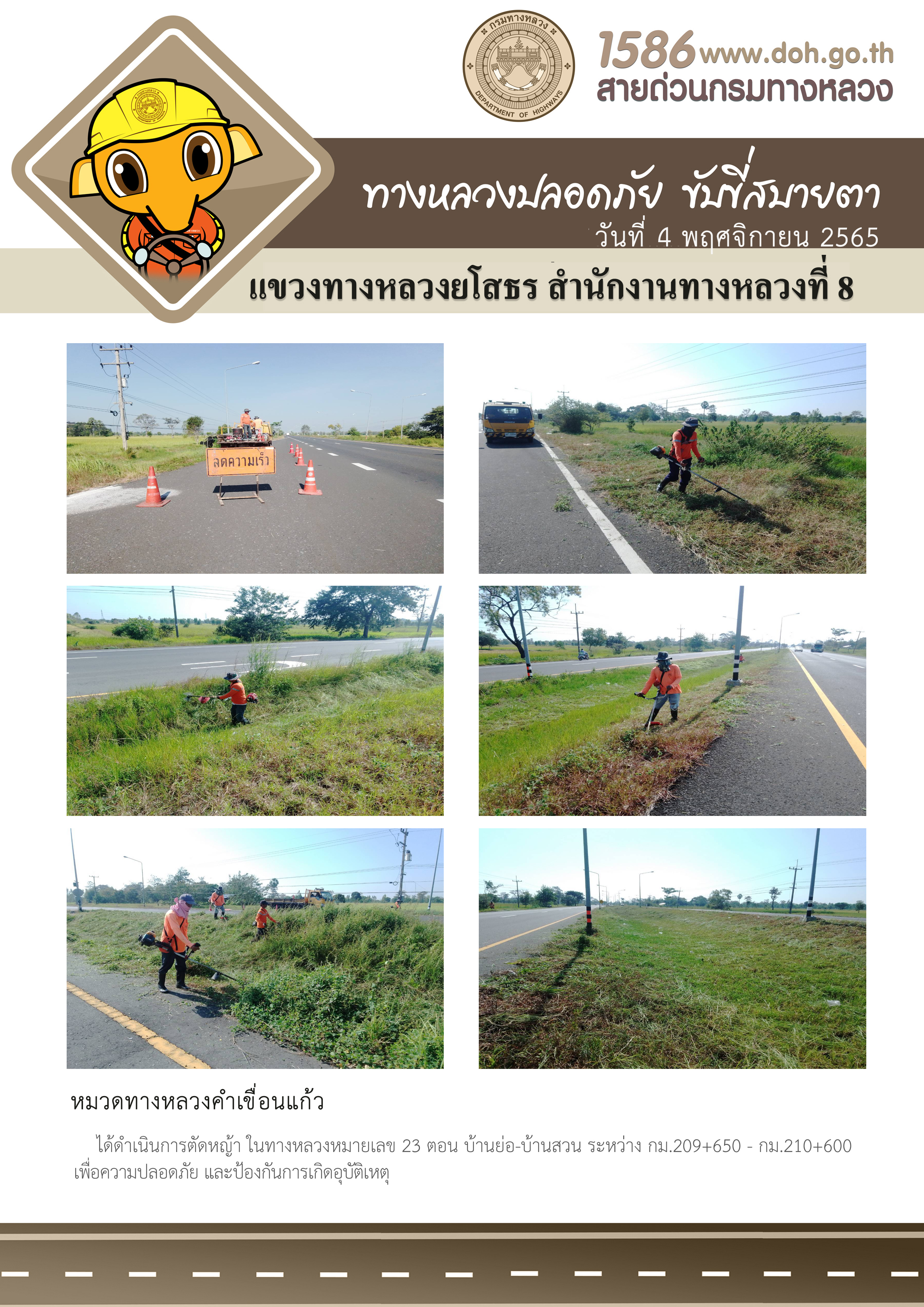 วันที่ 4 พฤศจิกายน 2565 หมวดทางหลวงคำเขื่อนแก้ว ได้ดำเนินการตัดหญ้า ในทางหลวงหมายเลข 23 ตอน บ้านย่อ-บ้านสวน ระหว่าง กม.209+650 - กม.210+600 เพื่อความปลอดภัย และป้องกันการเกิดอุบัติเหตุ