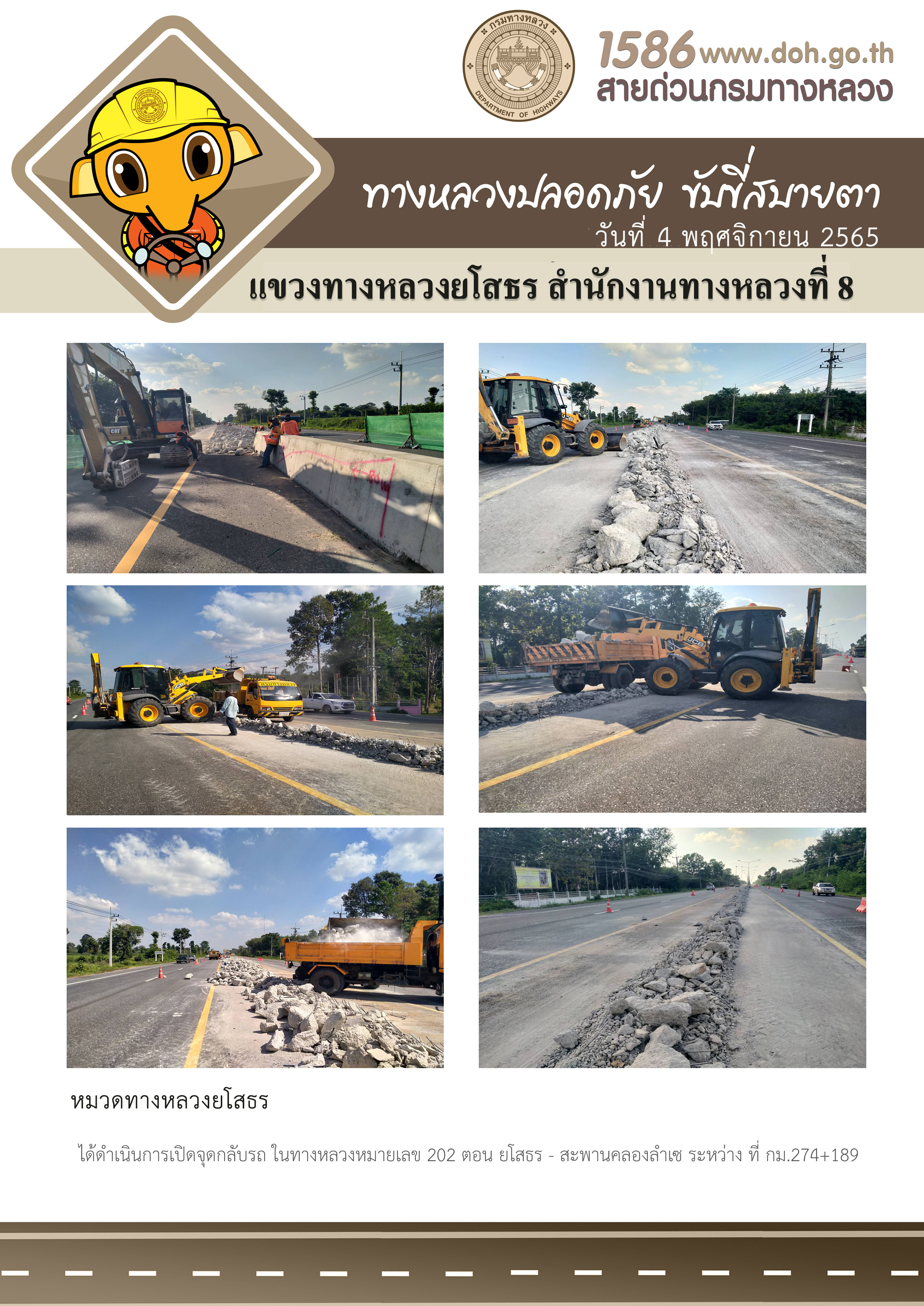 วันที่ 4 พฤศจิกายน 2565 หมวดทางหลวงยโสธร ได้ดำเนินการเปิดจุดกลับรถ ในทางหลวงหมายเลข 202 ตอน ยโสธร - สะพานคลองลำเซ ระหว่าง ที่ กม.274+189