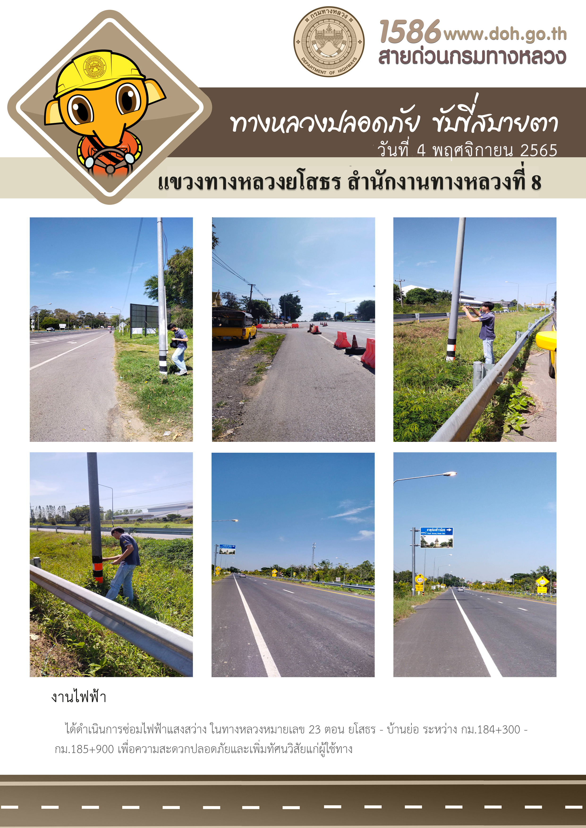 วันที่ 4 พฤศจิกายน 2565 งานไฟฟ้า ได้ดำเนินการซ่อมไฟฟ้าแสงสว่าง ในทางหลวงหมายเลข 23 ตอน ยโสธร - บ้านย่อ ระหว่าง กม.184+300 - กม.185+900 เพื่อความสะดวกปลอดภัยและเพิ่มทัศนวิสัยแก่ผู้ใช้ทาง