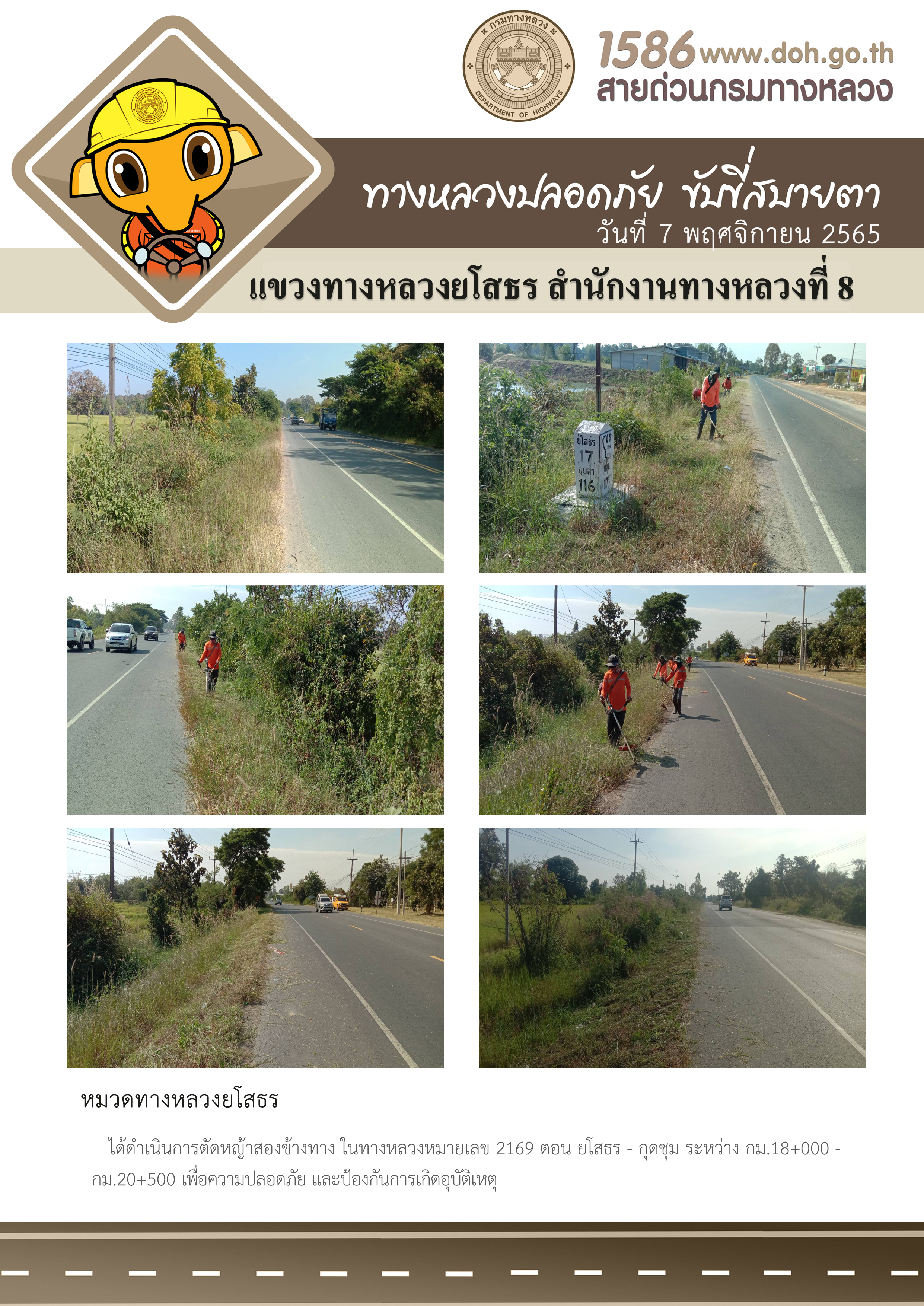 วันที่ 7 พฤศจิกายน 2565 หมวดทางหลวงยโสธร ได้ดำเนินการตัดหญ้าสองข้างทาง ในทางหลวงหมายเลข 2169 ตอน ยโสธร - กุดชุม ระหว่าง กม.18+000 - กม.20+500 เพื่อความปลอดภัย และป้องกันการเกิดอุบัติเหตุ
