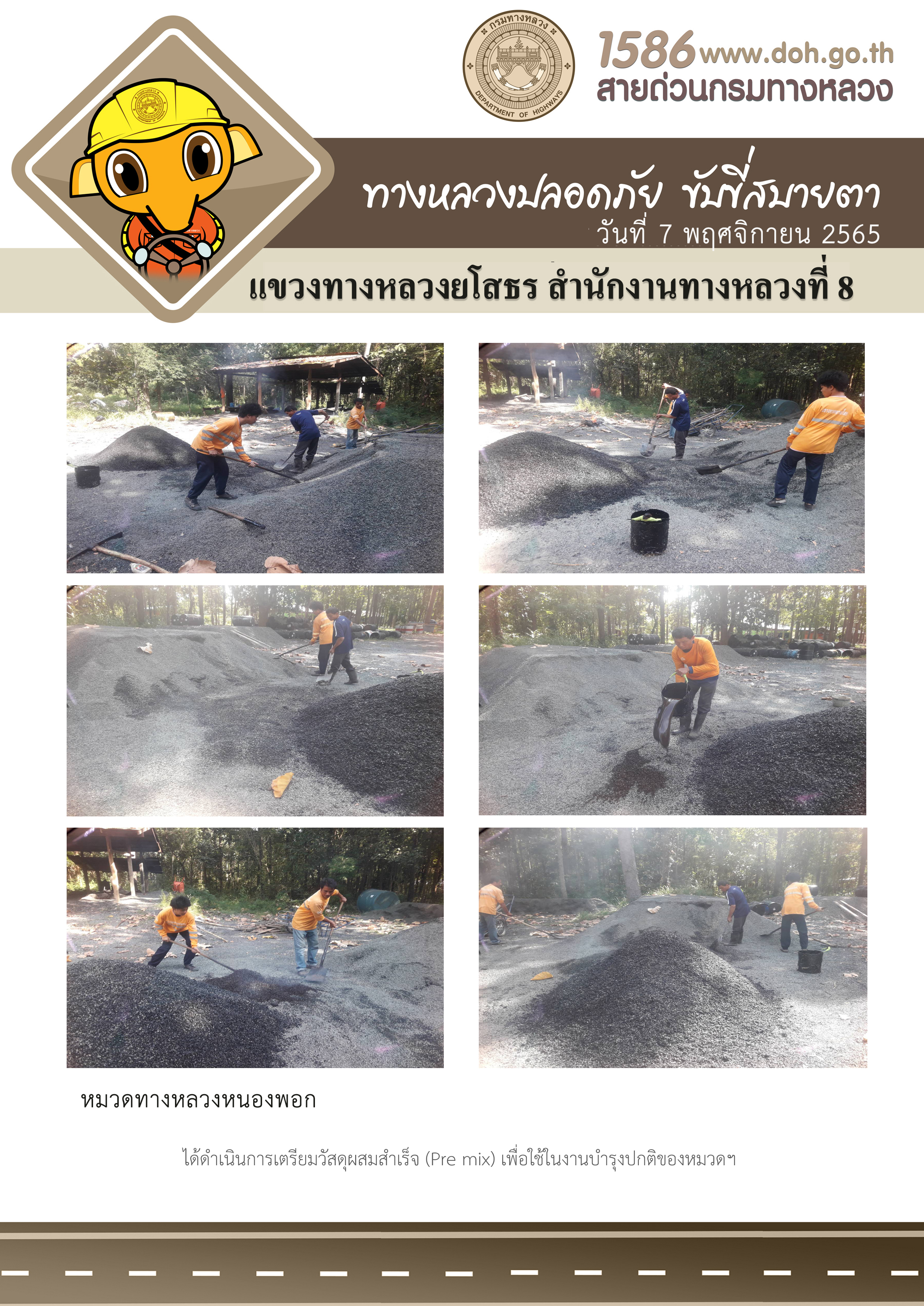 วันที่ 7 พฤศจิกายน 2565 หมวดทางหลวงหนองพอก ได้ดำเนินการเตรียมวัสดุผสมสำเร็จ (Pre mix) เพื่อใช้ในงานบำรุงปกติของหมวดฯ