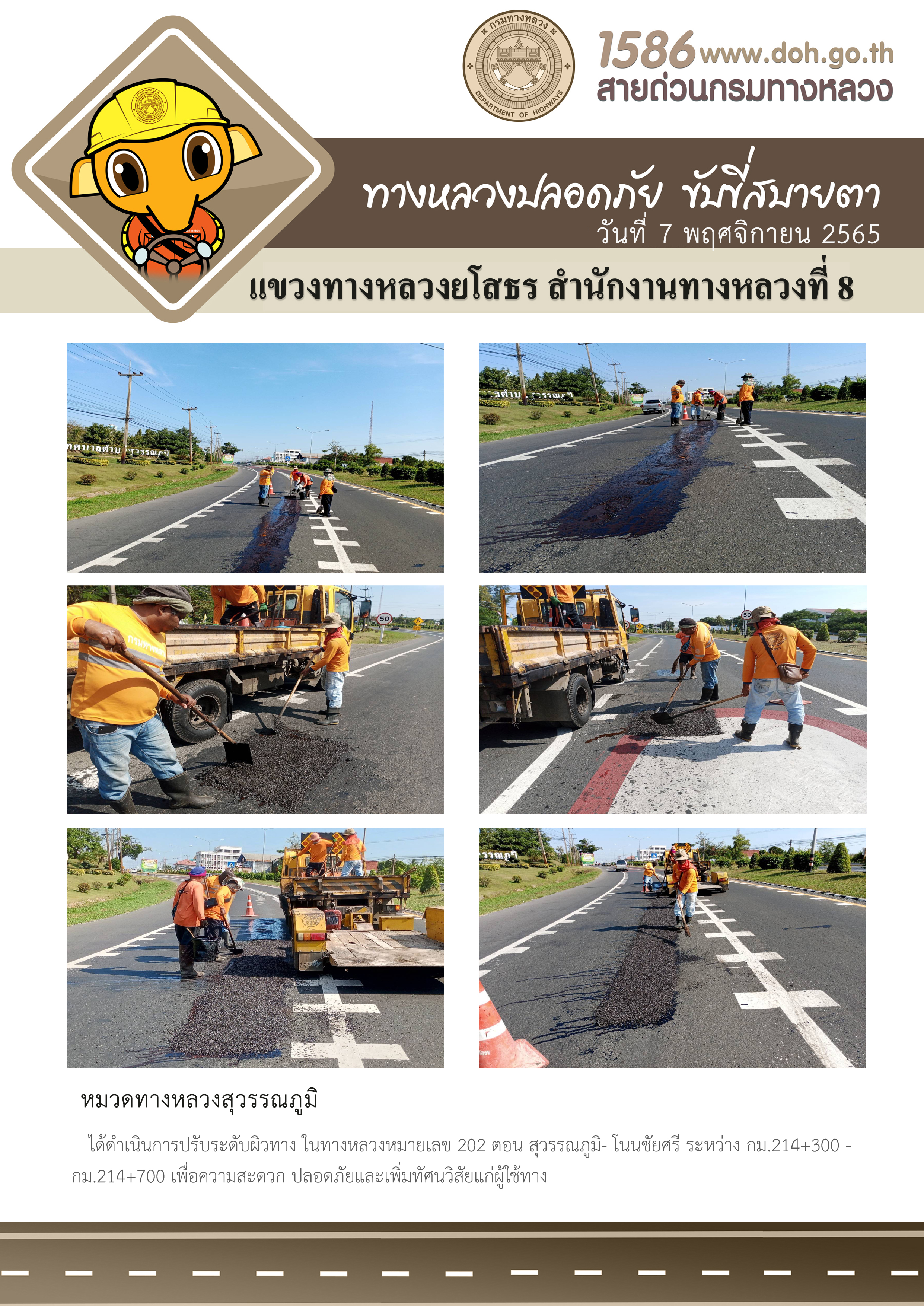 วันที่ 7 พฤศจิกายน 2565 หมวดทางหลวงสุวรรณภูมิ ได้ดำเนินการปรับระดับผิวทาง ในทางหลวงหมายเลข 202 ตอน สุวรรณภูมิ- โนนชัยศรี ระหว่าง กม.214+300 - กม.214+700 เพื่อความสะดวก ปลอดภัยและเพิ่มทัศนวิสัยแก่ผู้ใช้ทาง