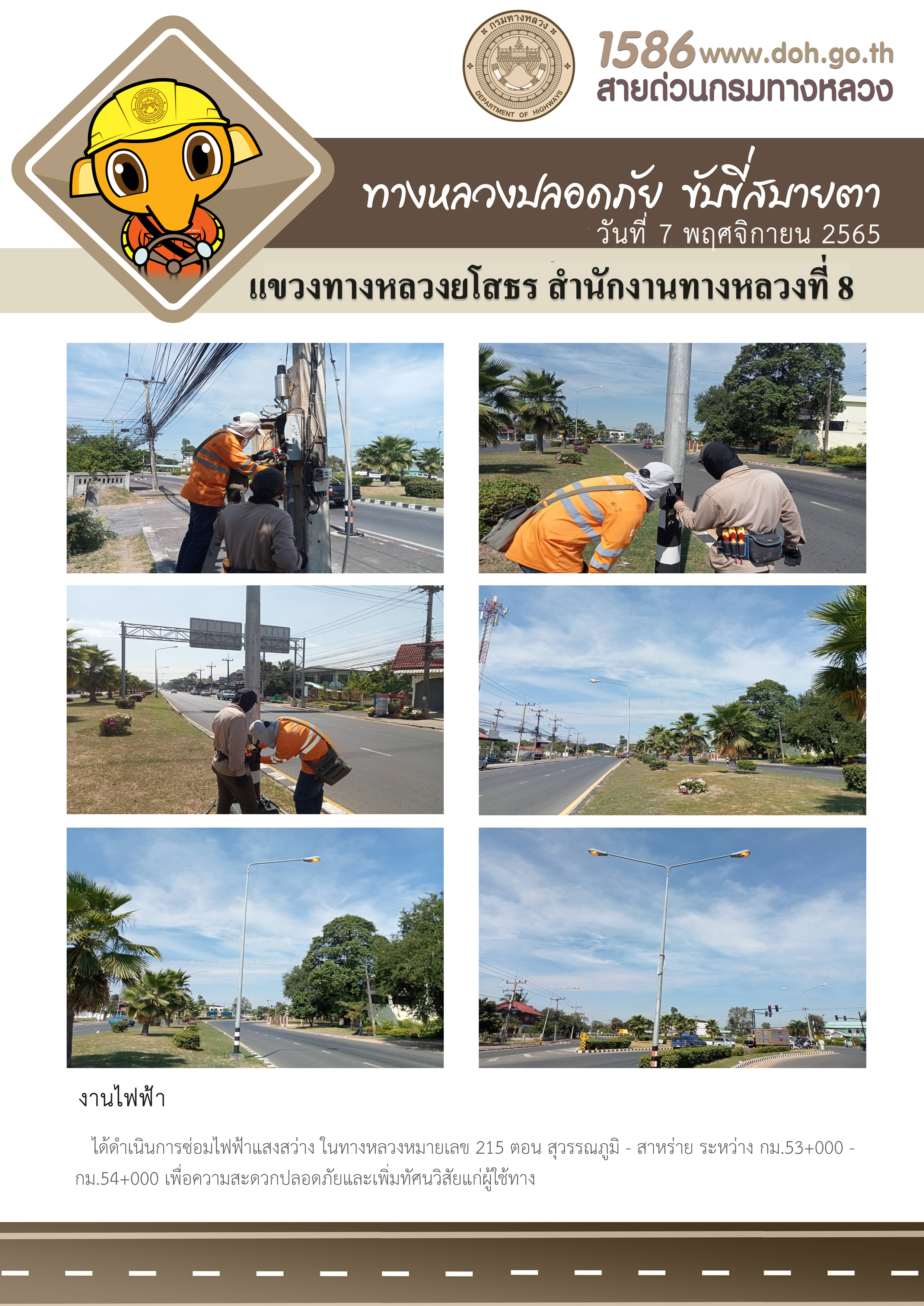 วันที่ 7 พฤศจิกายน 2565 งานไฟฟ้า ได้ดำเนินการซ่อมไฟฟ้าแสงสว่าง ในทางหลวงหมายเลข 215 ตอน สุวรรณภูมิ - สาหร่าย ระหว่าง กม.53+000 - กม.54+000 เพื่อความสะดวกปลอดภัยและเพิ่มทัศนวิสัยแก่ผู้ใช้ทาง